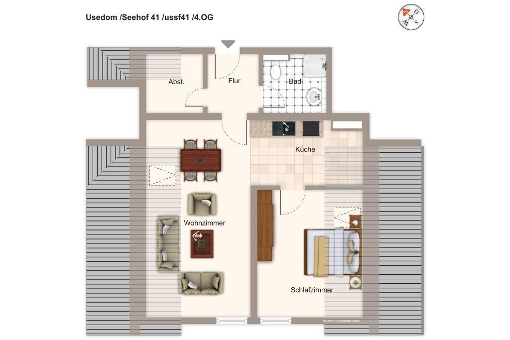 Die Ferienanlage glänzt mit ihrer einzigartigen Lage zwischen Ostseestrand und Schloonsee. Das Apartment in Südlage befindet sich im 4. Obergeschoss, dem Dachgeschoss, im Haus „Großer Seehof“.