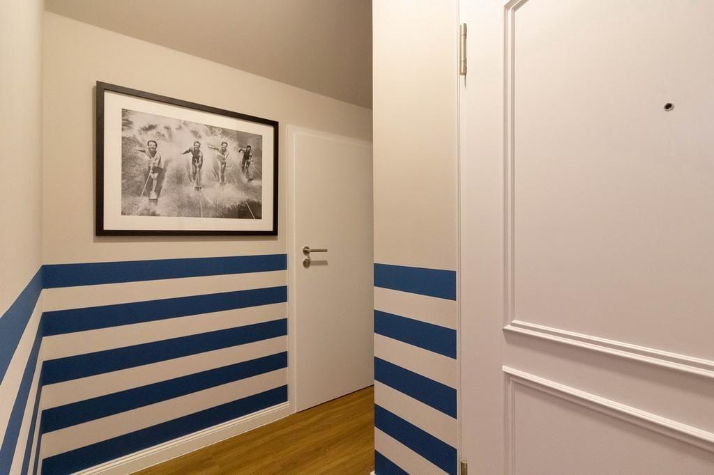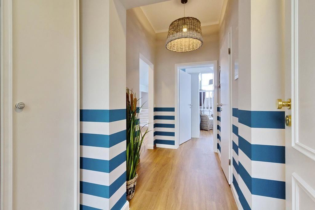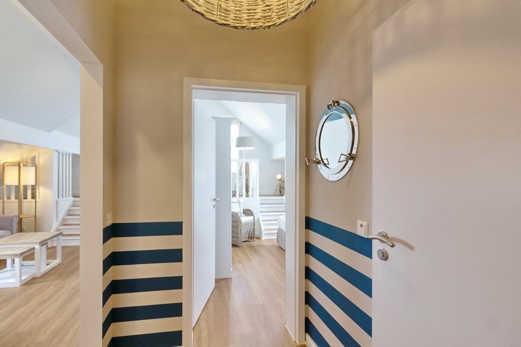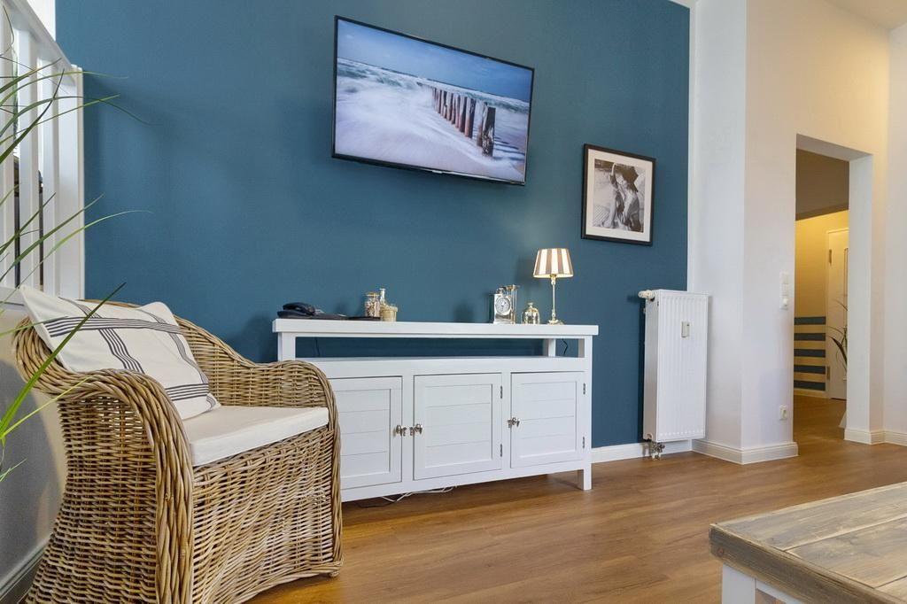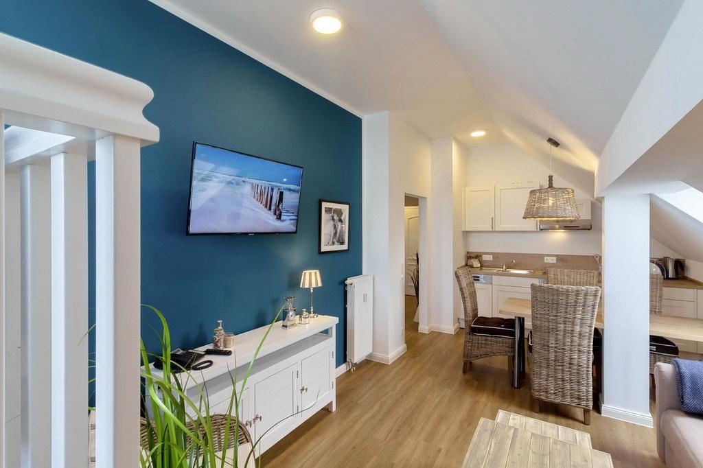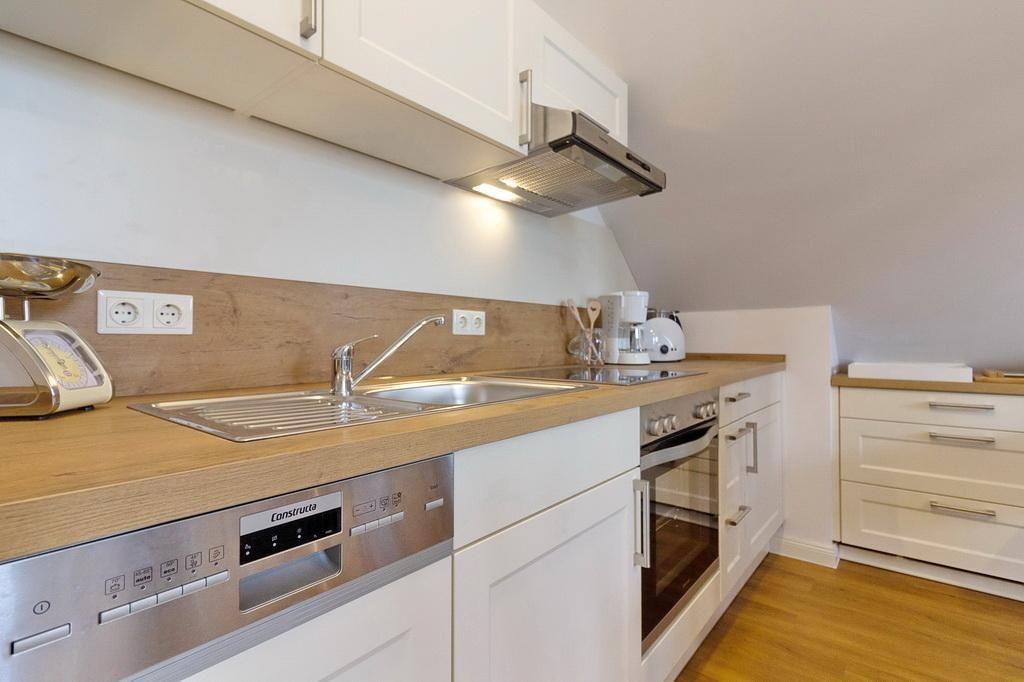 Zum weiteren Interieur des liebevoll maritim eingerichteten Apartments gehören eine voll ausgestattete offene Küche mit Wasserkocher, Kaffeemaschine, Toaster, Backofen, Geschirrspüler, Mikrowelle und Tiefkühlfach.