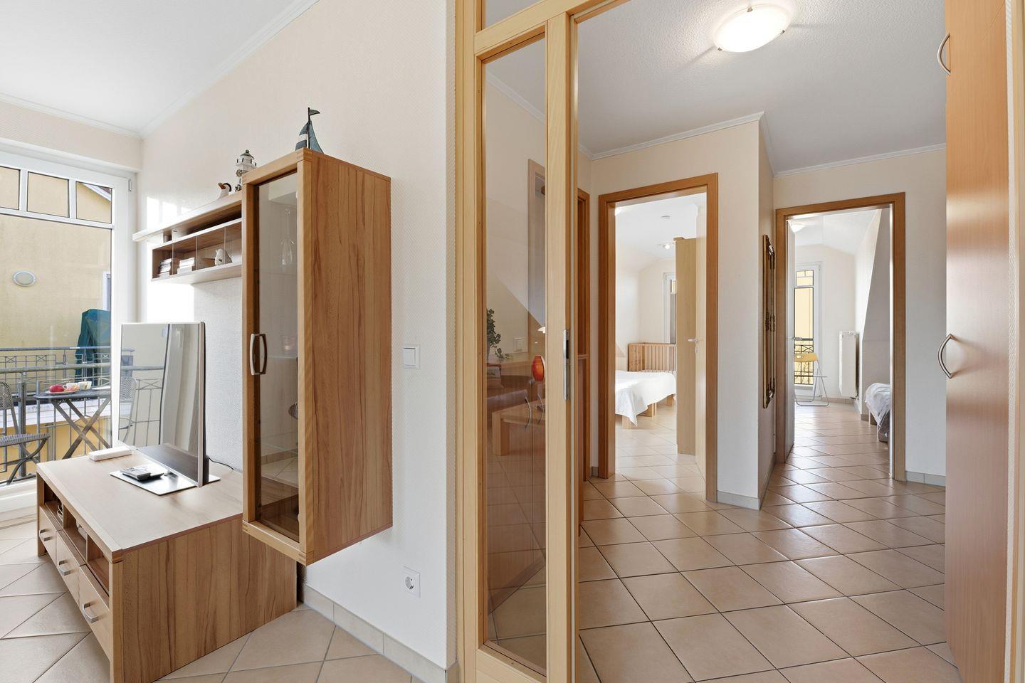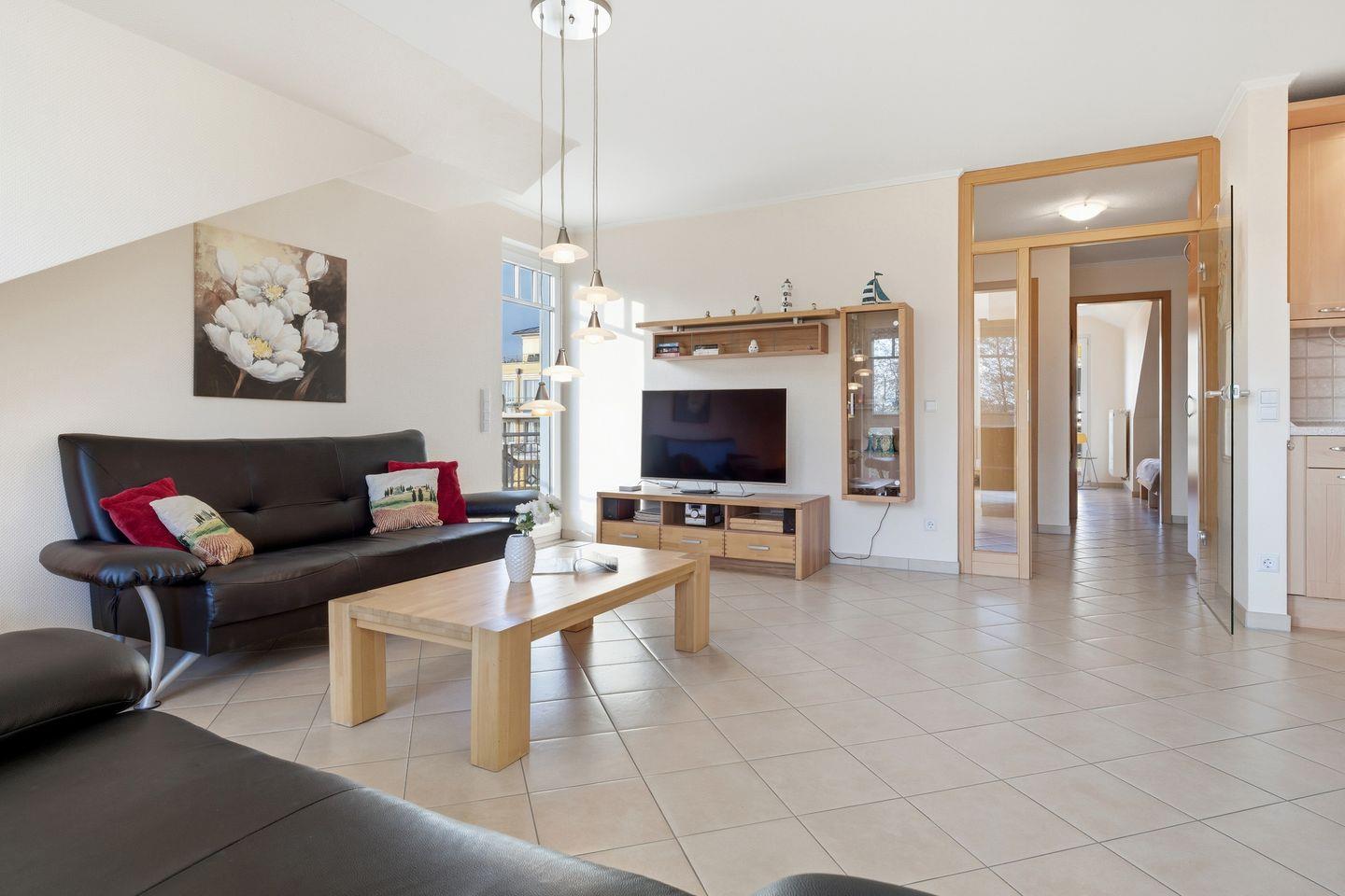 Der lichtdurchflutete Wohnbereich schafft eine behagliche Atmosphäre und geht nahtlos in eine moderne, offene Küche mit kompletter Ausstattung über. Vom Wohnraum aus gelangen Sie auf den sonnigen Balkon, der einen perfekten Rückzugsort für entspannte Stunden bietet. Ideal für einen erholsamen Aufenthalt an der Ostsee!