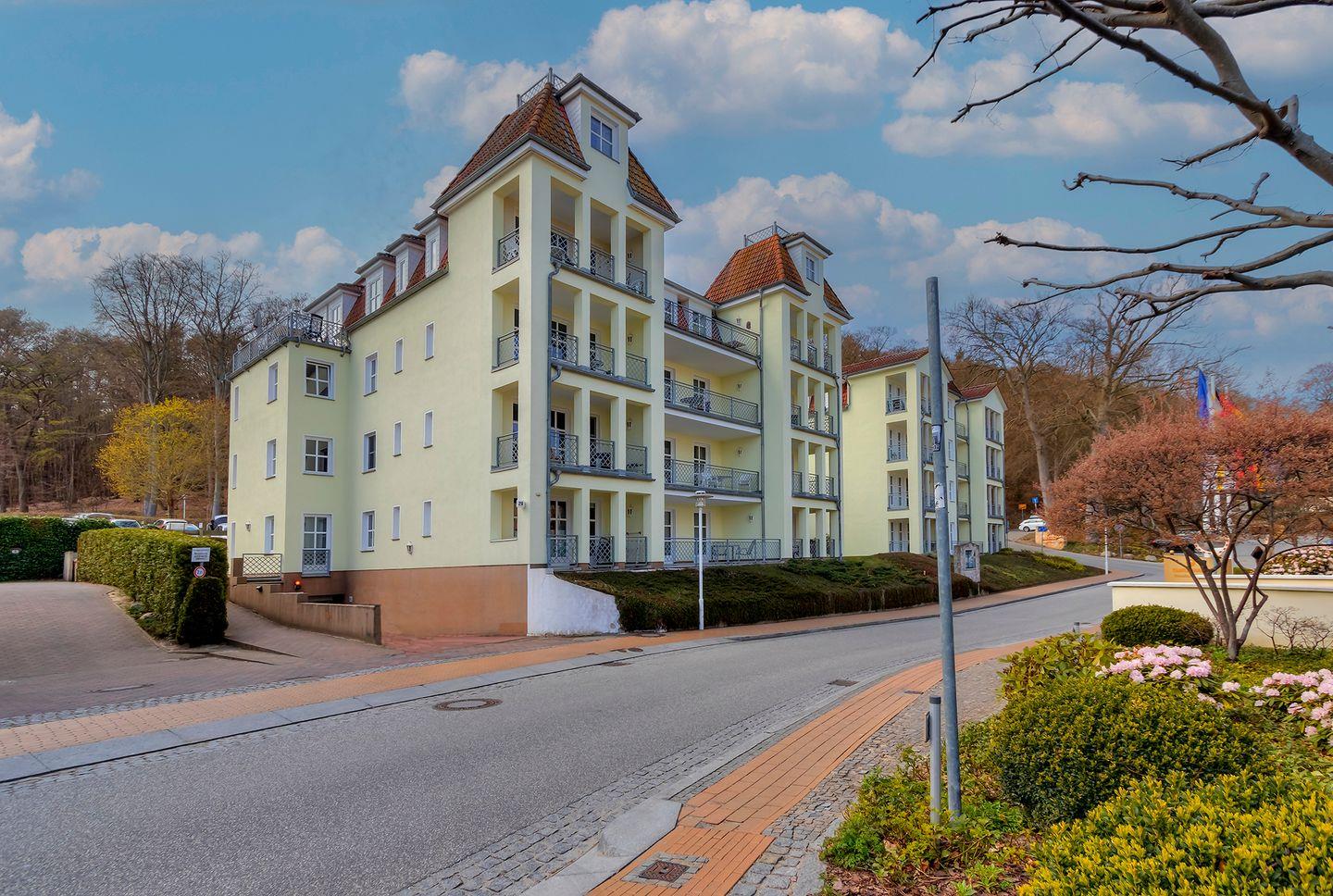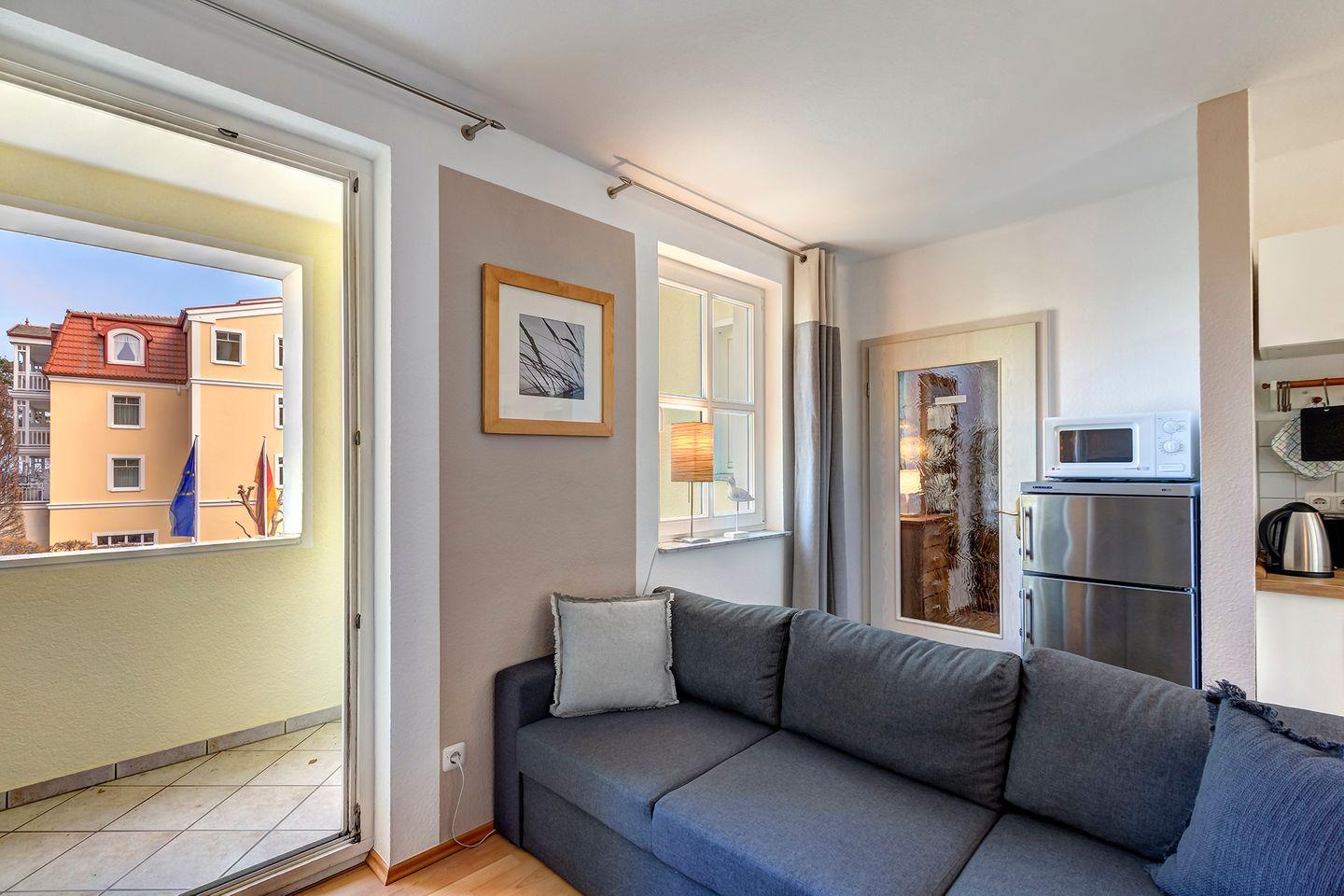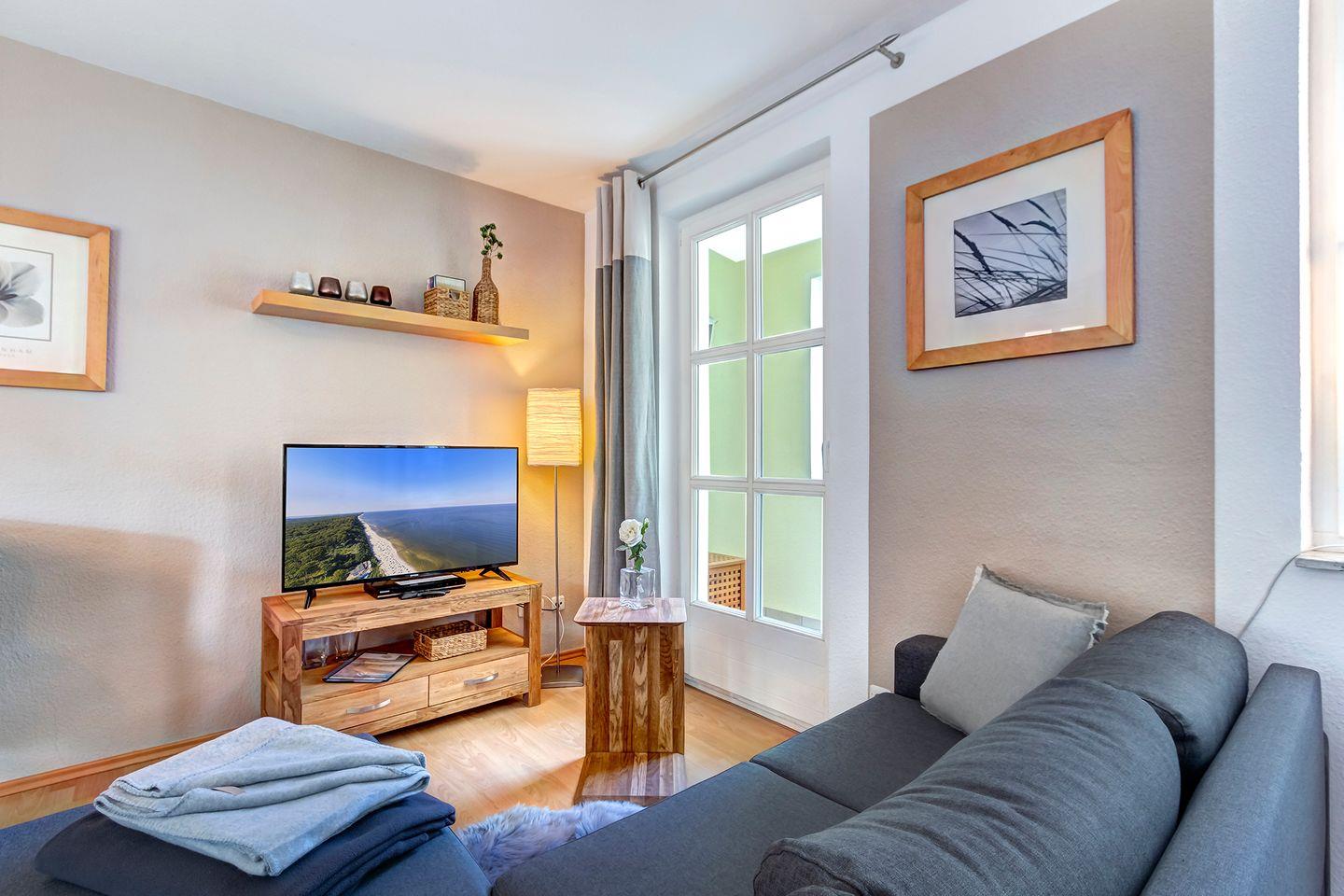 Diese im 1 Stock der Wohnanlage gelegene 2 Zimmer Wohnung hat eine absolut seltene Besonderheit. Durch die Architektur des Gebäudes verfügt das Wohnzimmer über eine Fensterfront mit einem kleinen Balkon in Nordrichtung (Ostsee) wie auch gleichzeitig über eine Fensterfront und einen großen Balkon in südlicher Ausrichtung (Sonnenseite).Die Einrichtung mit eleganten und hochwertigen Möbeln, einer komplett ausgestatteten Einbauküche lässt keine Urlaubswünsche an ein modernes Ferienappartement offen.