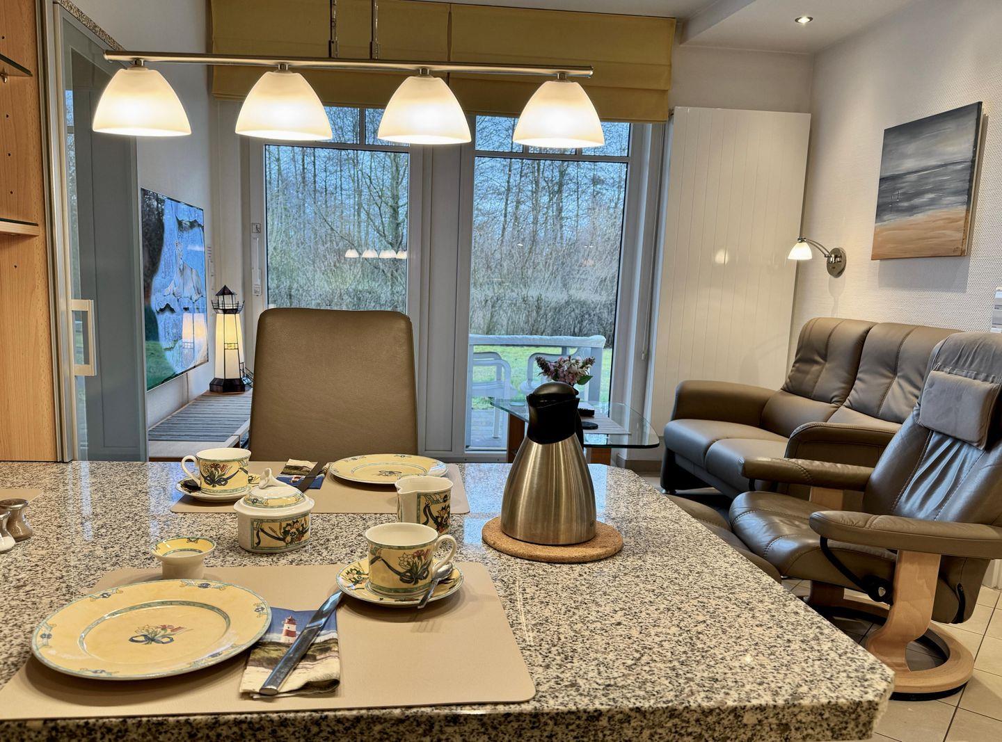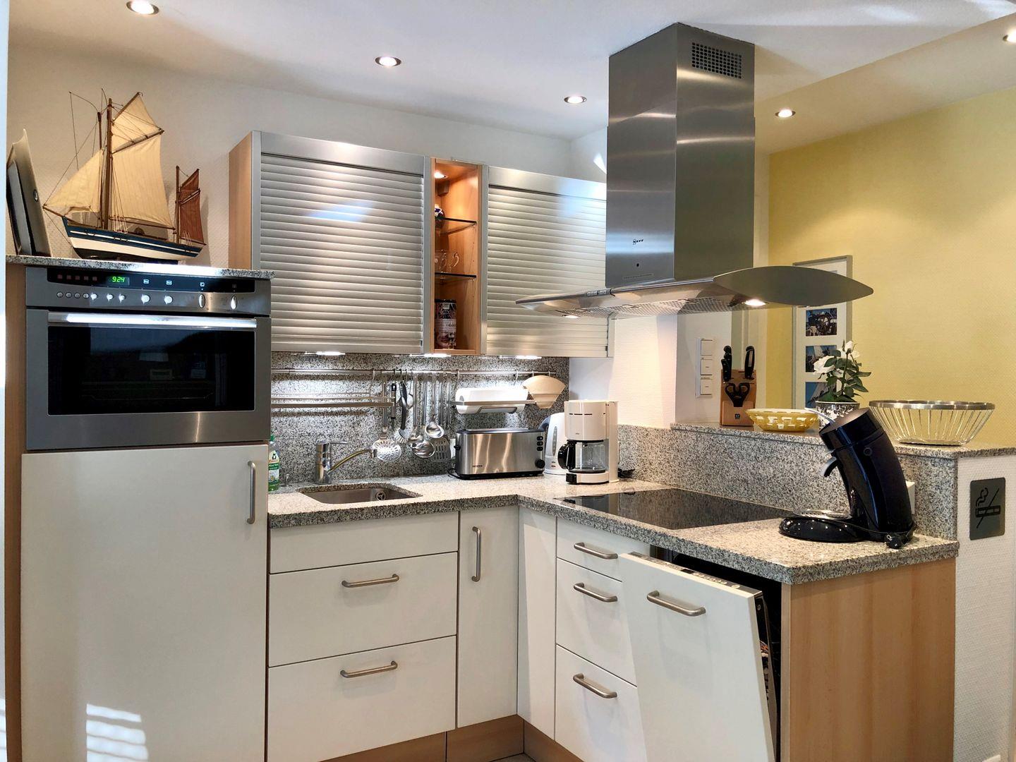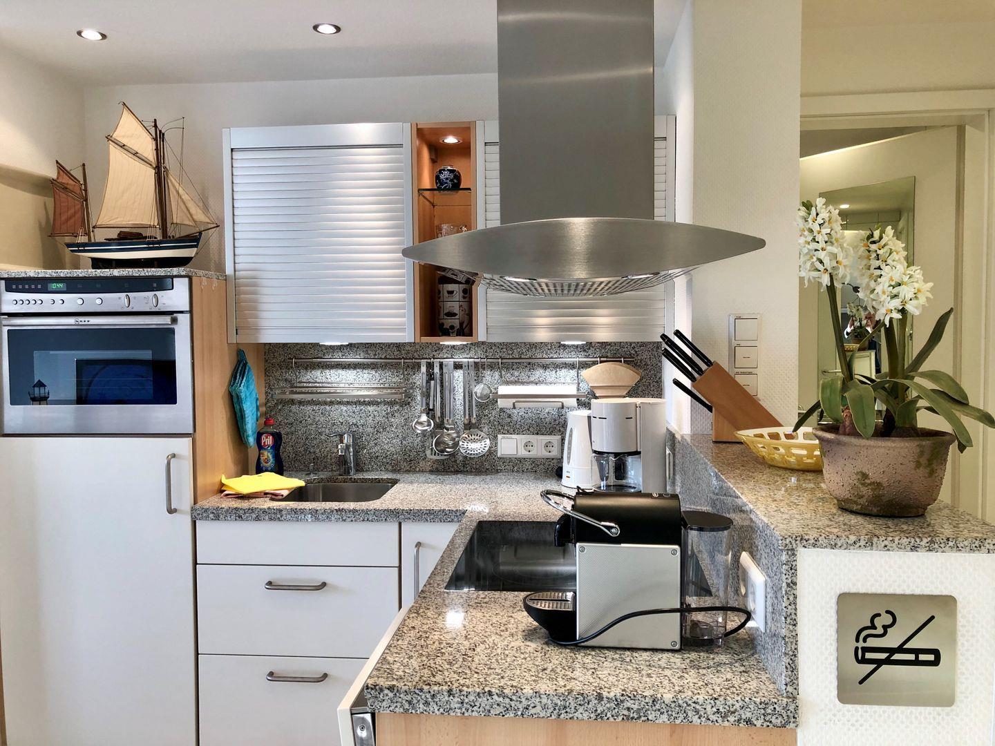 Ideal für 2 Gäste, ist die Wohnung exklusiv und geschmackvoll eingerichtet. Sie verfügt über einen kombinierten Wohn- und Essbereich mit moderner Granit-Küchenecke, ein Schlafzimmer mit einem komfortablen Doppelbett (Liegehöhe 60 cm), elektrisch verstellbaren Lattenrost und TV sowie ein hochwertiges Duschbad mit integrierter Waschmaschine.