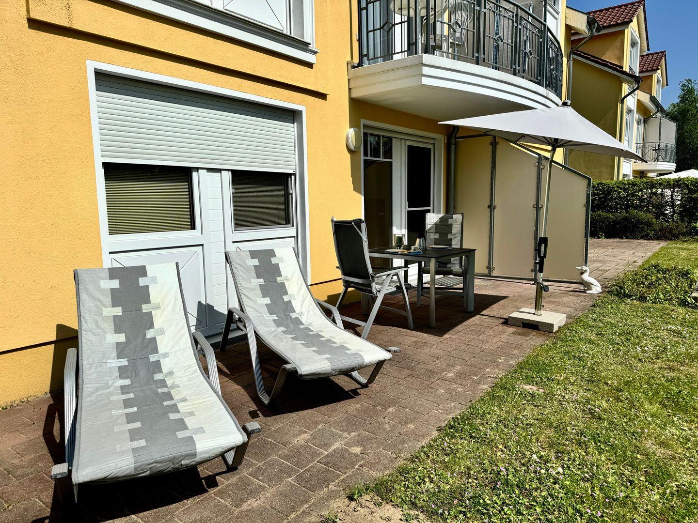 Die freundliche Ferienwohnung im Erdgeschoss bietet eine einladende Sonnenterrasse, ausgestattet mit gemütlicher Sitzgruppe und Gartenliegen.