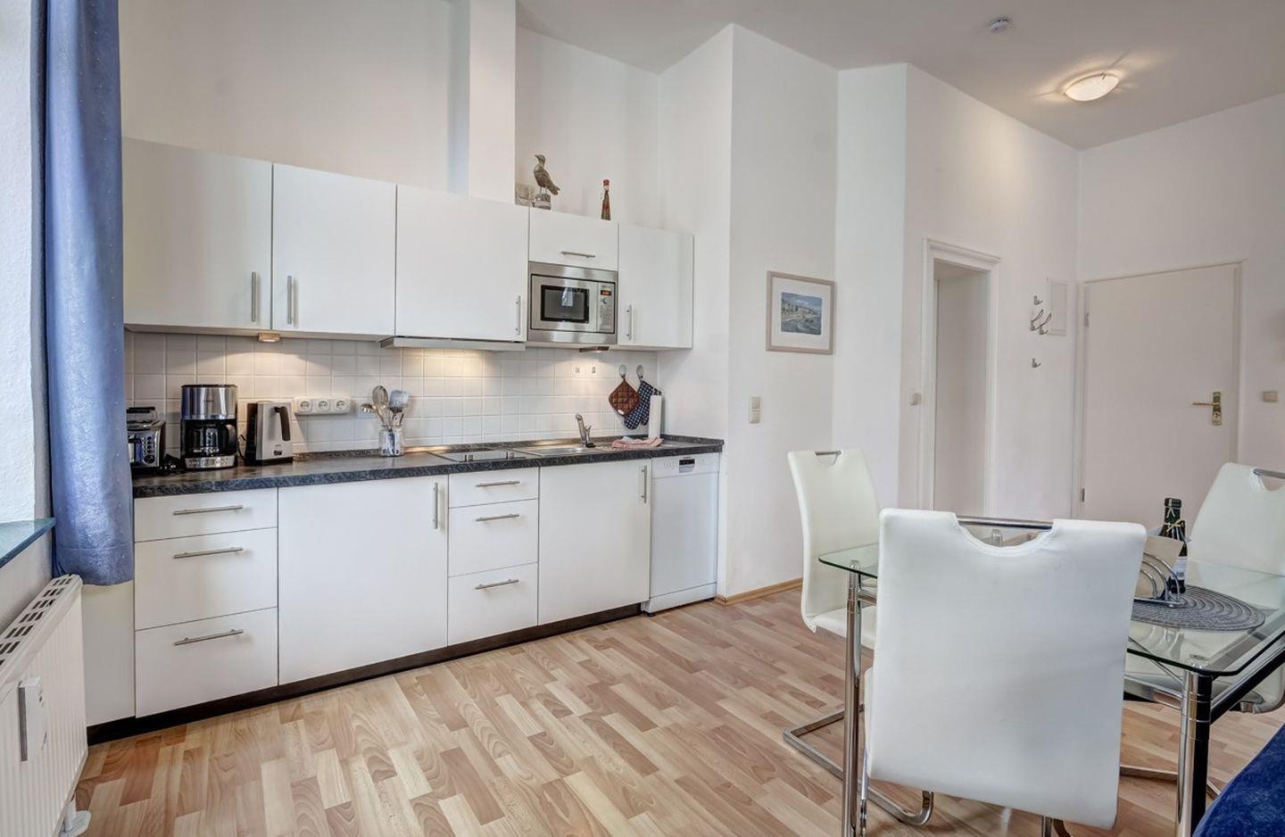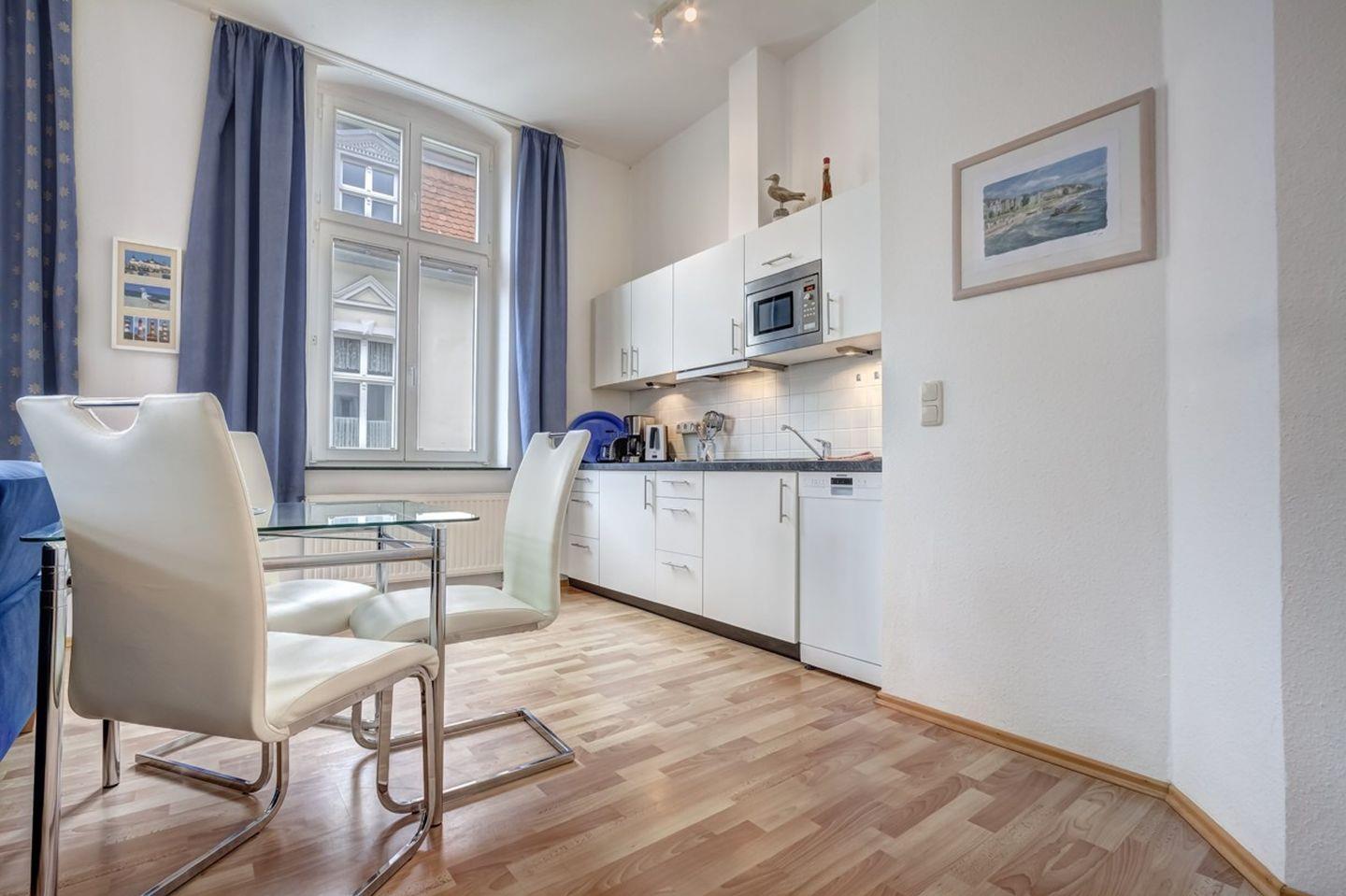 Die Wohnung ist ideal für 2 Personen und bietet einen gemütlichen kombinierten Wohn- und Schlafbereich. Zur Ausstattung gehören eine komplett eingerichtete Küchenzeile und ein separater Essplatz. Eine komfortable Sitzgruppe lädt zum Entspannen ein, und von hier aus haben Sie Zugang zum Balkon in sonniger Süd-West-Lage – perfekt, um die frische Meeresluft und entspannte Stunden im Freien zu genießen.