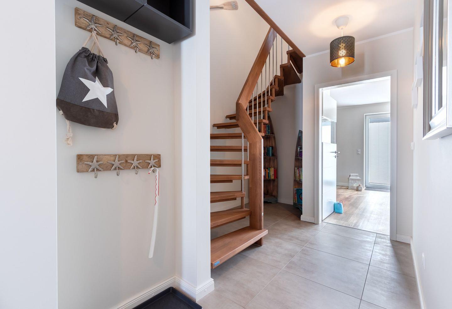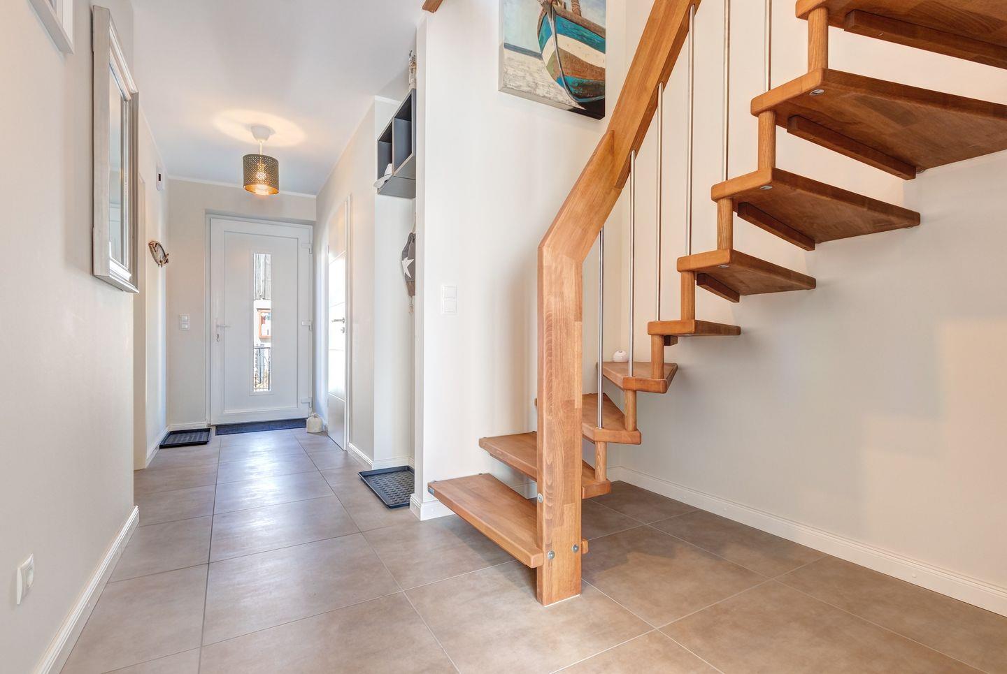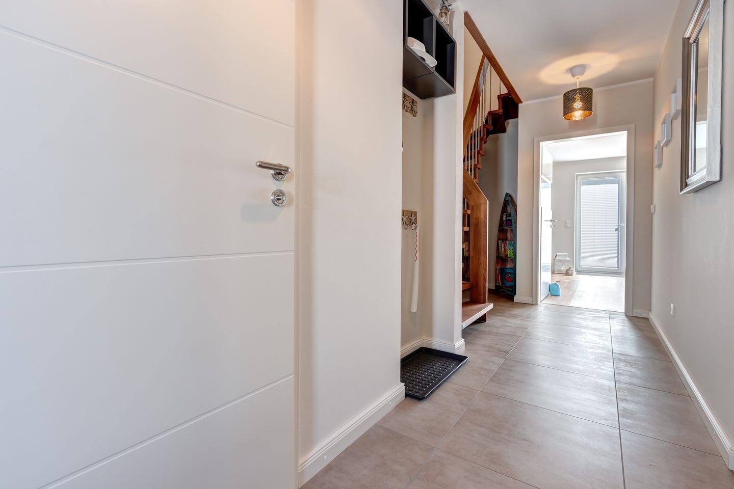 Im Erdgeschoss erwartet Sie ein offener Wohn-/ Essbereich mit einer modernen, voll ausgestatteten Einbauküche, die mit einem Induktionskochfeld ausgestattet ist. Das große, gemütliche Sofa lädt zum Ausruhen und Entspannen ein. In den kälteren Monaten spendet der Kamin neben der Fußbodenheizung zusätzliche Wärme und schafft eine behagliche Atmosphäre. Außerdem finden Sie im Erdgeschoss ein Duschbad und einen geräumigen Hauswirtschaftsraum, der mit einer Mikrowelle ausgestattet ist.