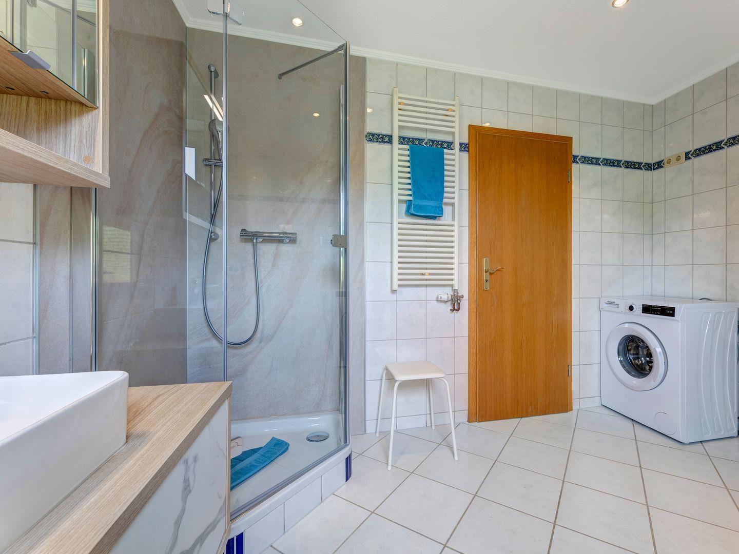 Das Badezimmer ist mit einer Badewanne/Dusche, einem WC und einem Waschtisch ausgestattet. Ein Haartrockner und eine Waschmaschine stehen ebenfalls zur Verfügung, falls Sie während Ihres Aufenthalts Wäsche waschen müssen.