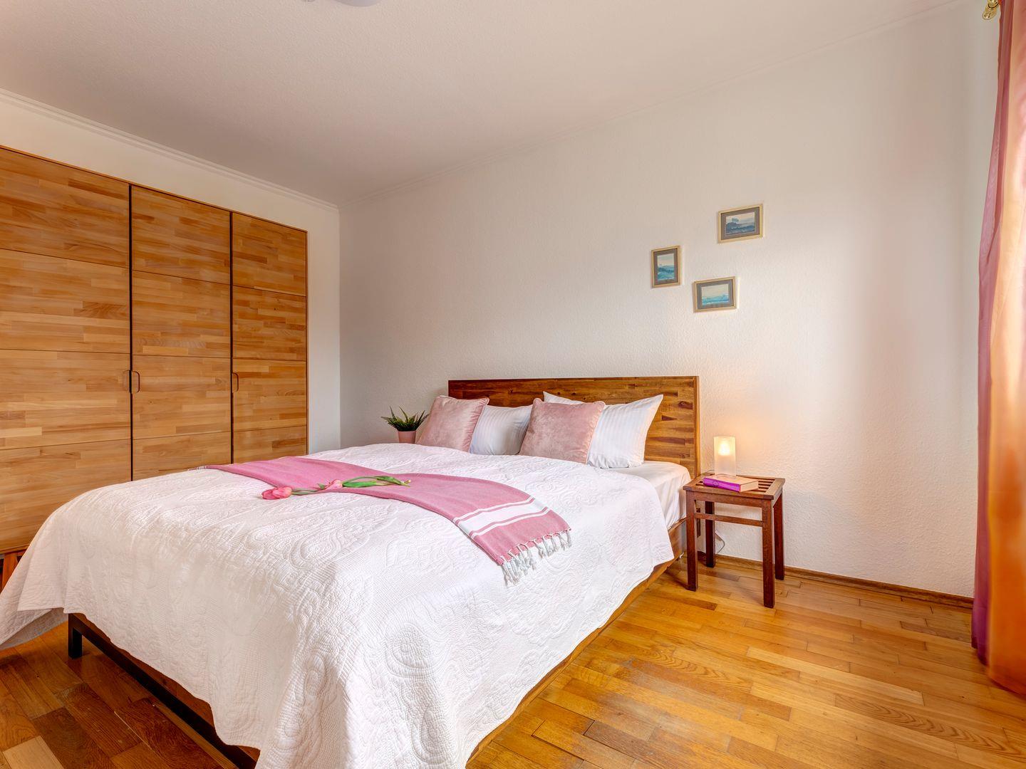 Das zweite Zimmer ist ein Schlafzimmer, das Ihnen erholsamen Schlaf garantiert. Das großzügige Bett misst 1,80 x 2,00 m. Im Schlafzimmer befinden sich zudem ein Kleiderschrank und Nachttische mit Lampen auf beiden Seiten des Bettes.