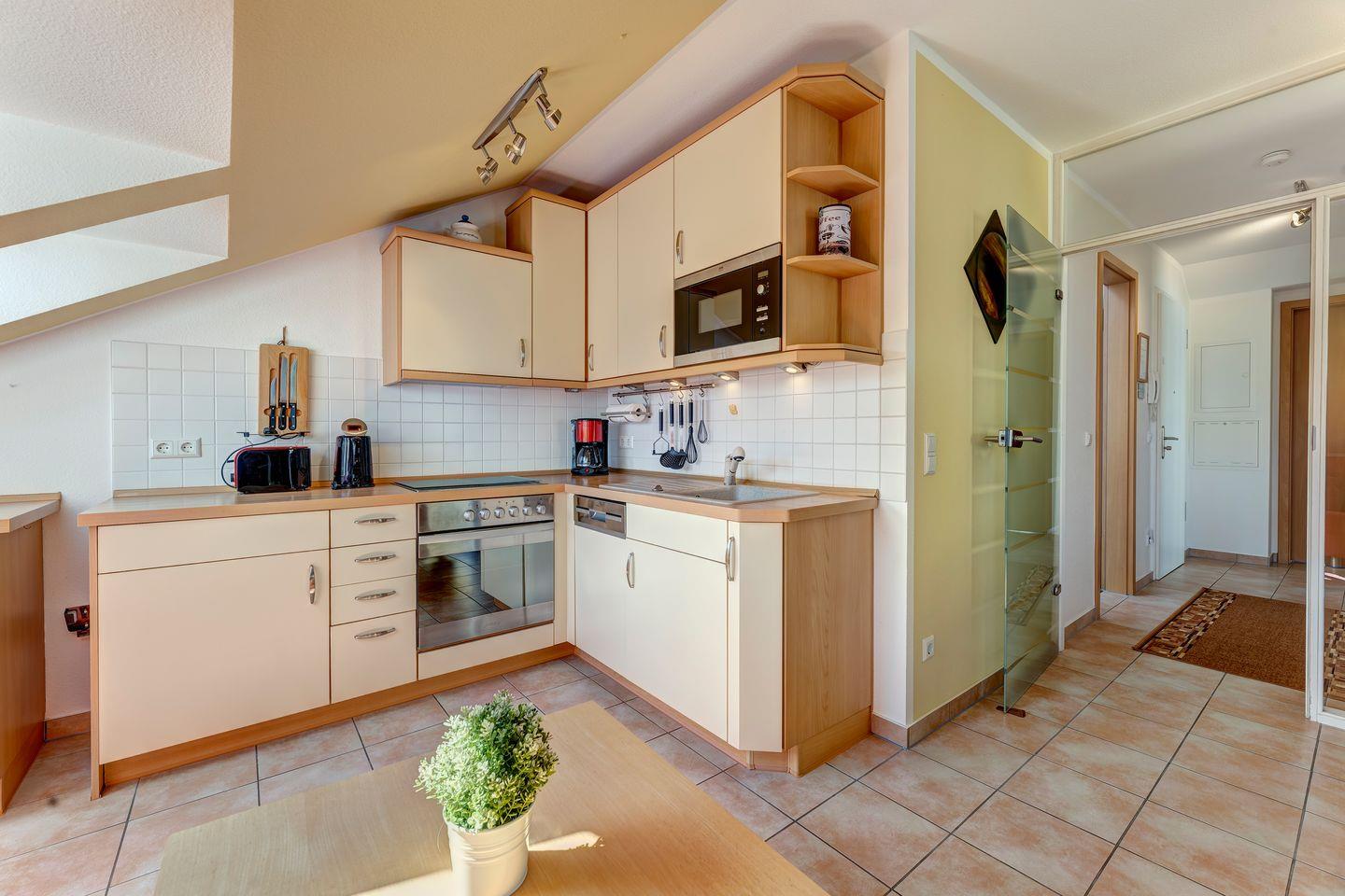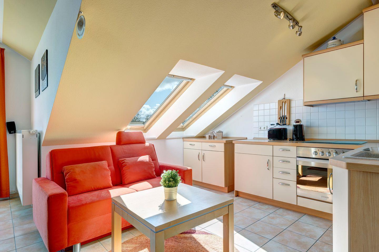 Ideal für 4 Gäste, ist die Ferienwohnung exklusiv und geschmackvoll eingerichtet. Sie verfügt über einen kombinierten Wohn- und Essbereich mit moderner Küche, zwei Schlafzimmer davon eins mit einem komfortablen Doppelbett und das zweite mit einem Schlafsofa und einem TV-Gerät. Das Badezimmer verfügt über eine Dusche mit flachem Einstieg, WC sowie einem Haartrockner und Kosmetikspiegel.
