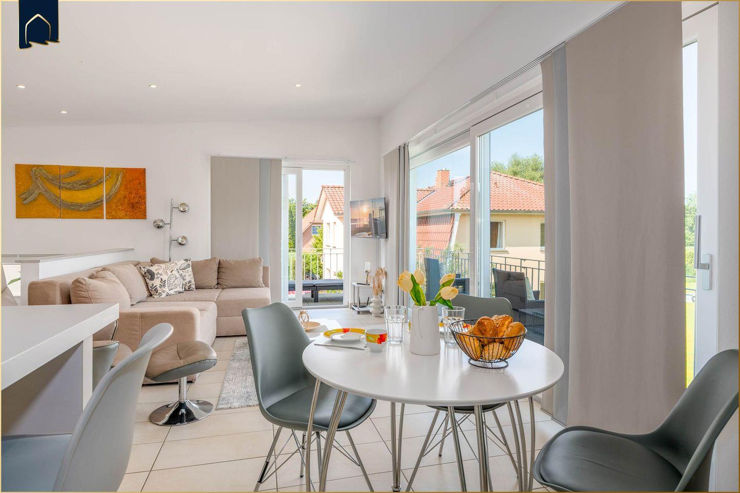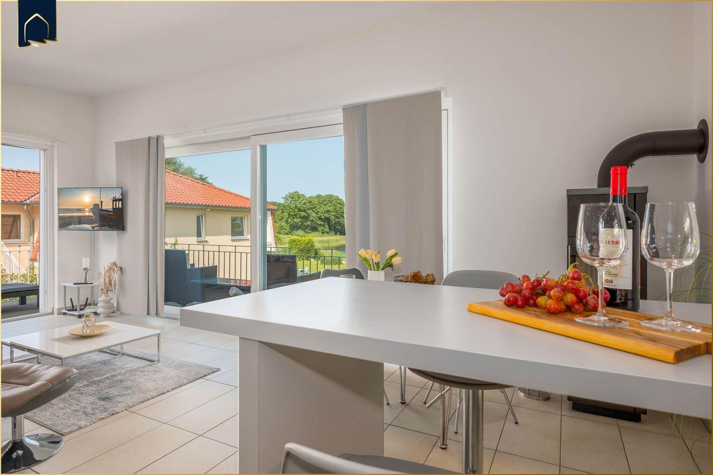 Auf ca. 53 m² erwartet Sie eine geschmackvoll eingerichtete Ferienwohnung für zwei Personen. Der helle Wohn- und Essbereich bildet das Herzstück der Wohnung. Hier sorgen ein gemütlicher Kamin, ein Esstisch und der direkte Zugang zum Garten für eine angenehme Wohlfühlatmosphäre – zu jeder Jahreszeit.