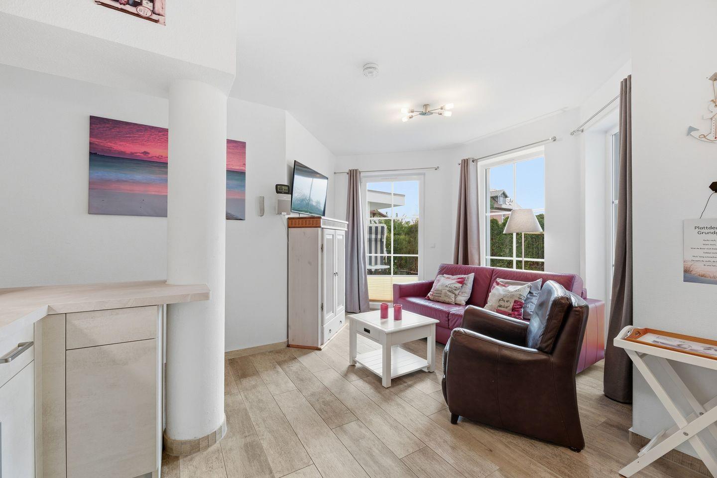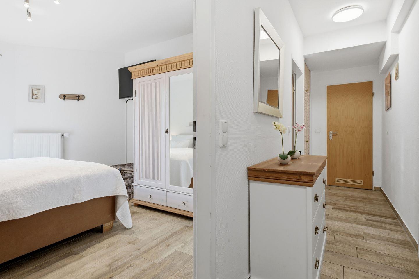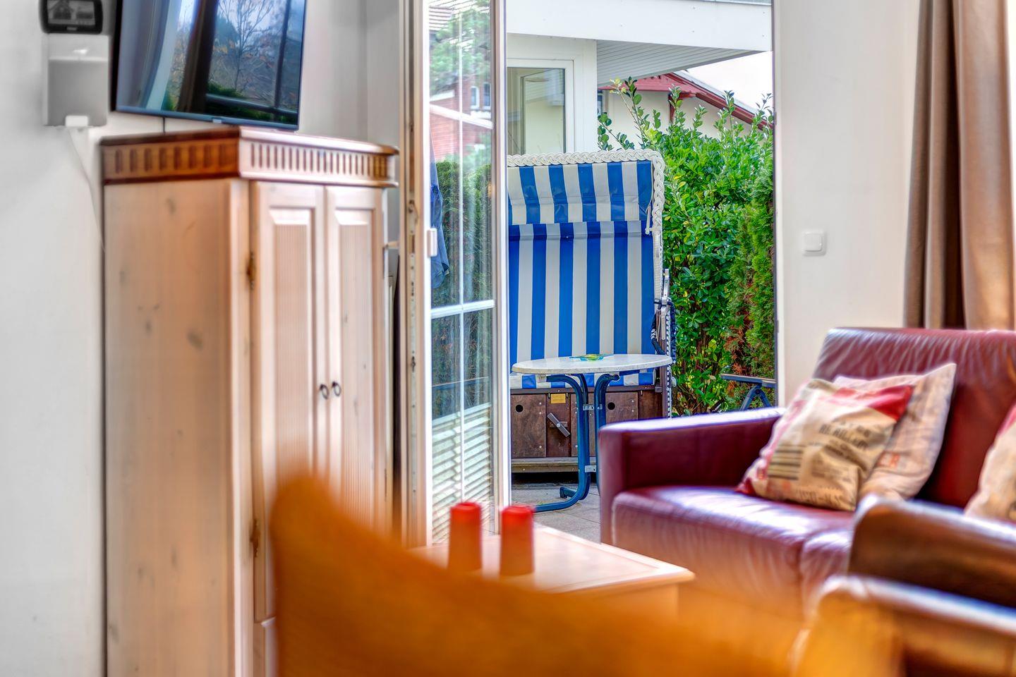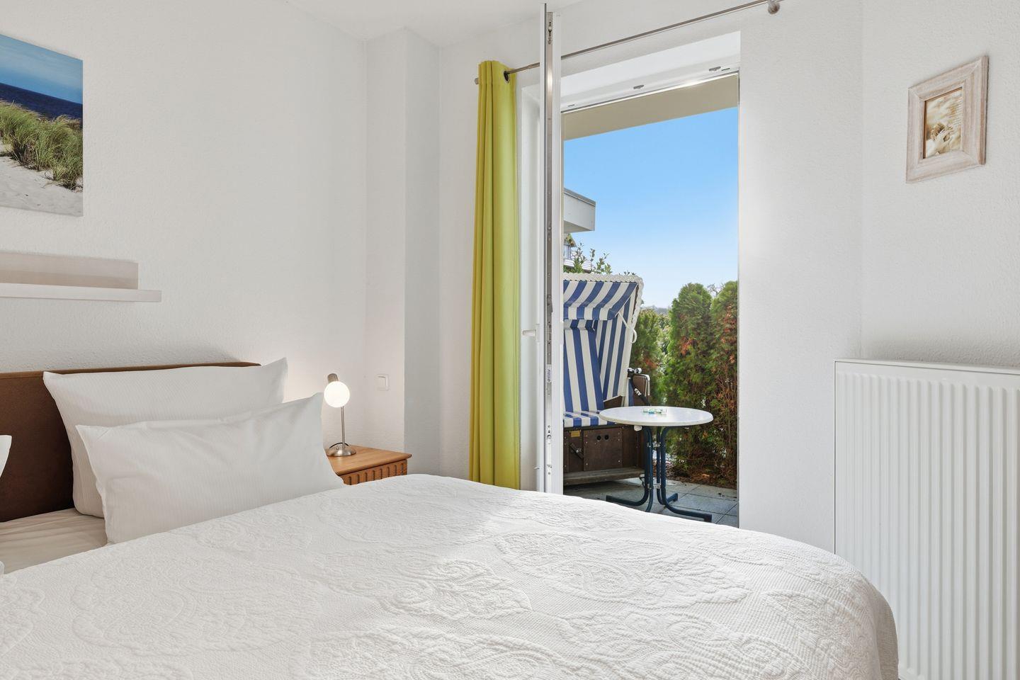 Von hier aus haben Sie Zugang zur Südterrasse mit einem Strandkorb. Das Schlafzimmer ist mit einem Doppelbett (1,80m x 2,00m), Flat-TV und einem Kleiderschrank ausgestattet. Im innenliegenden Bad finden Sie einen Waschtisch, Dusche und WC. Für Ihren Komfort steht die Erstausstattung Wäsche (Bettwäsche & Handtücher) für Sie bereit.