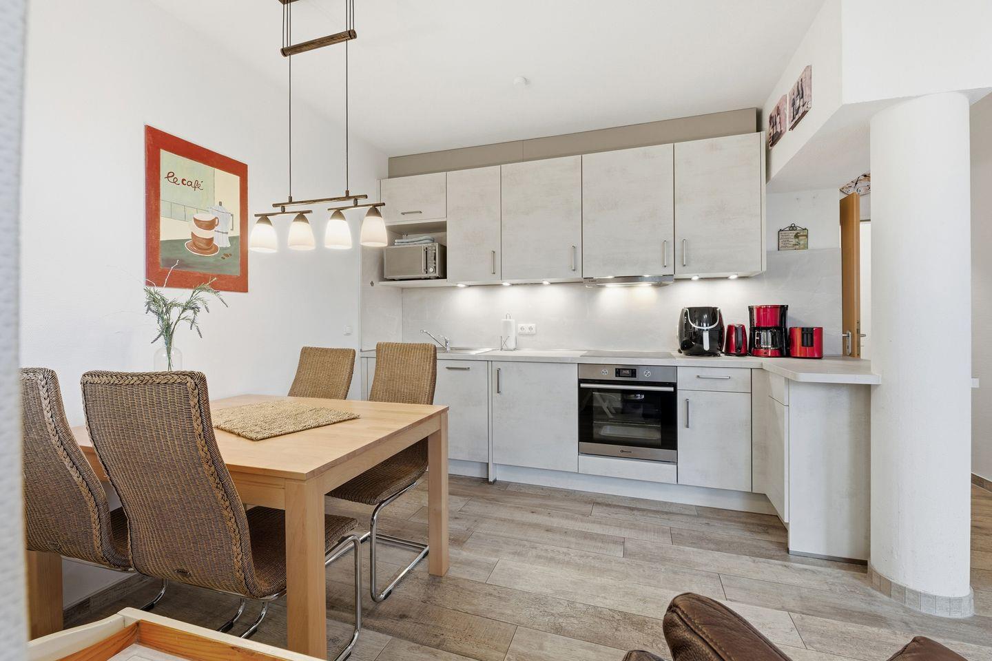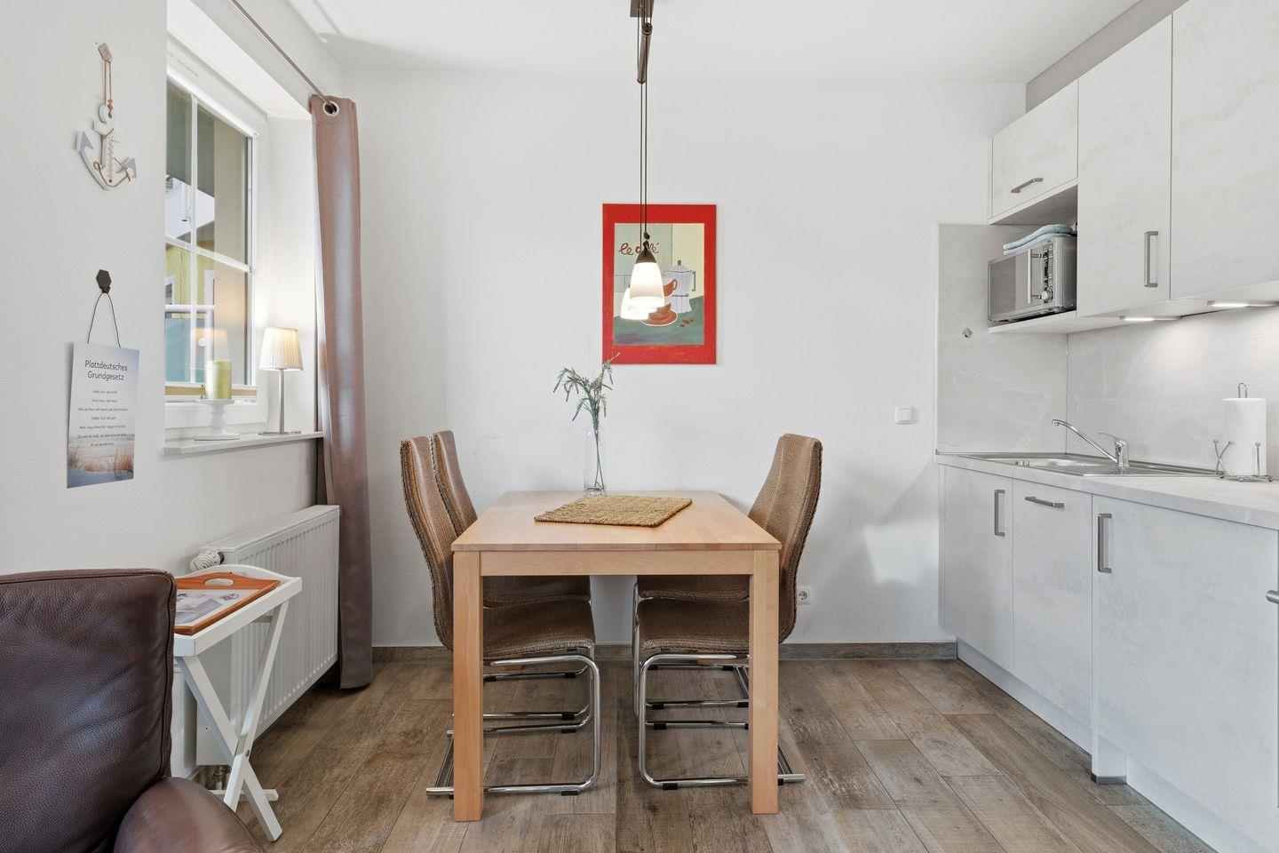 Die Ferienwohnung Dünenresidenz "Tini Mar" befindet sich im Erdgeschoss der Dünenresidenz Bansin. Hier haben 2 bis 3 Personen Platz, entspannte Urlaubstage zu verbringen. Im hellen Wohn- Essbereich befindet sich eine Schlafcouch (als Aufbettungsmöglichkeit für 1 Person) mit Flat-TV, eine komplett neu ausgestattete Küchenzeile (Ceranfeld, Geschirrspüler, Backofen und Mikrowelle) und ein Essplatz für 4 Personen.