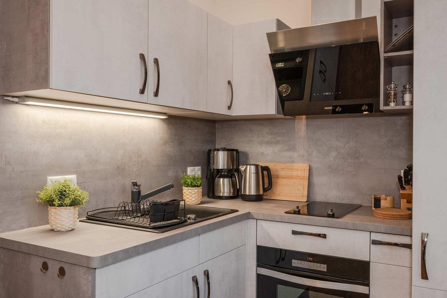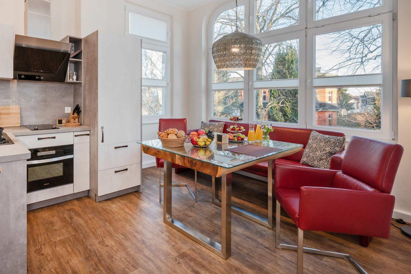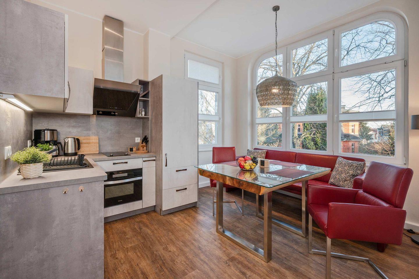 Im offenen Wohn- und Essbereich erwartet Sie eine wohnliche Atmosphäre. Der Wohnraum ist mit einem gemütlichen Sofa und zwei Fernsehern ausgestattet, sodass ein angenehmer Aufenthalt an Regentagen oder am Abend gewährleistet ist. Der Essbereich mit Esstisch ist offen in die modern ausgestattete Küche integriert. Hier finden Sie alles, was Sie für Ihren Aufenthalt benötigen: Herd, Mikrowelle, Kühlschrank mit Gefrierfach, Kaffeemaschine, Toaster, Wasserkocher sowie ausreichend Geschirr und Besteck. Auch ein Abfalleimer und ein Esstisch gehören selbstverständlich zur Ausstattung.