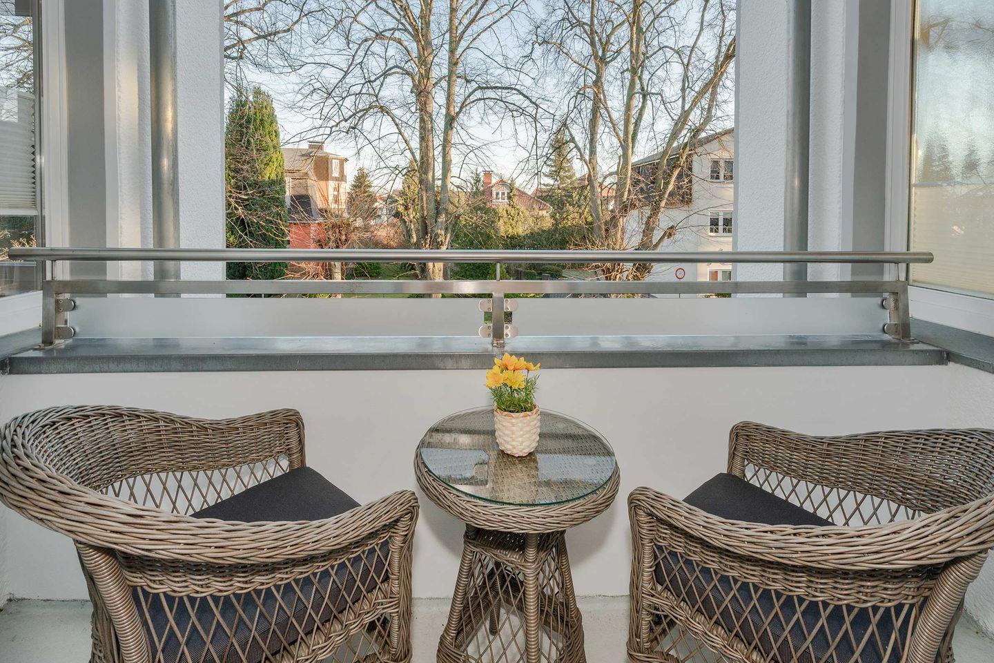 Die Wohnung verfügt über einen eigenen Balkon, der zum Entspannen einlädt und einen angenehmen Rückzugsort bietet. Alle Fenster sind mit Sichtschutz ausgestattet, was für Privatsphäre und ein angenehmes Wohngefühl sorgt.