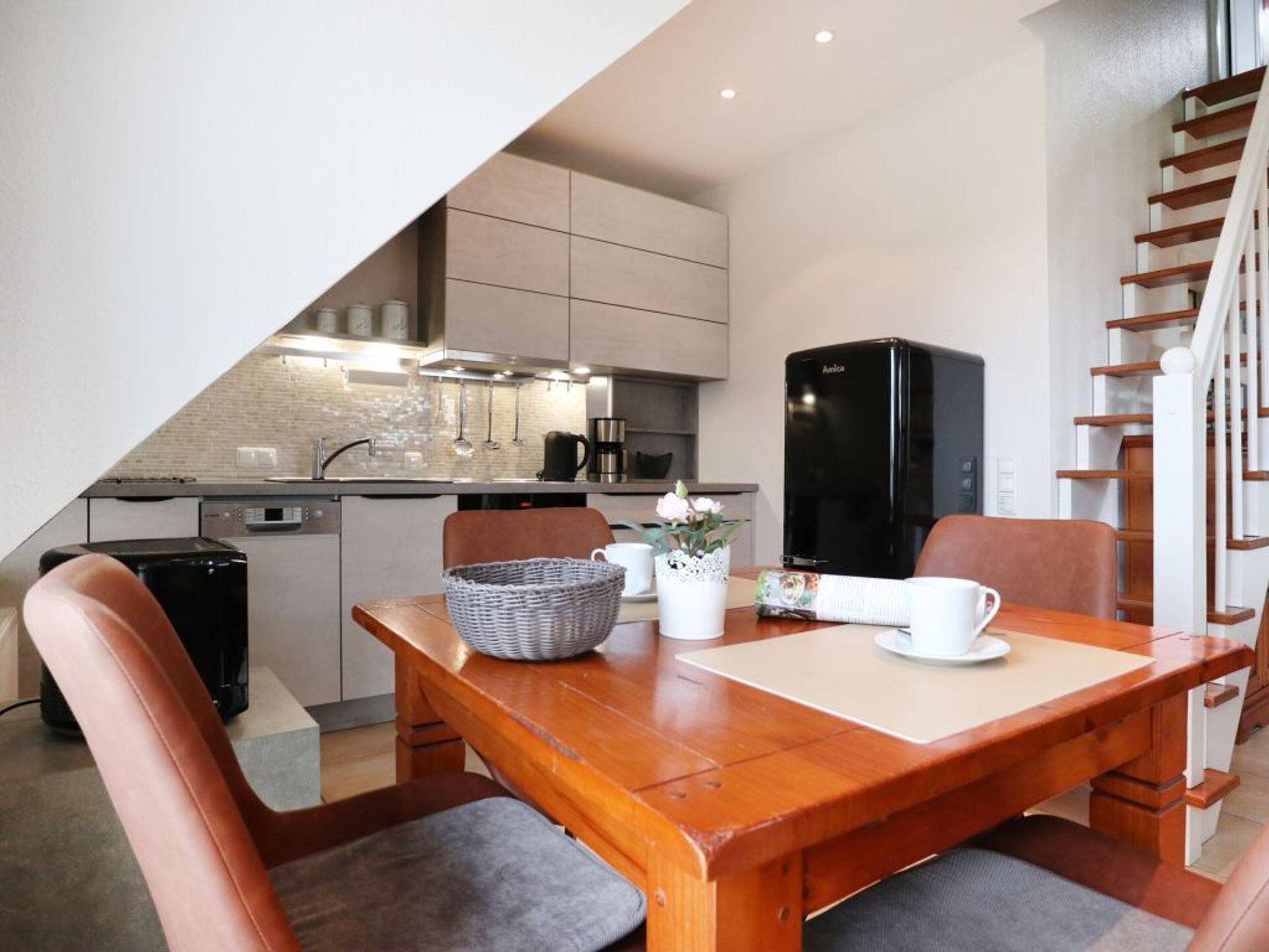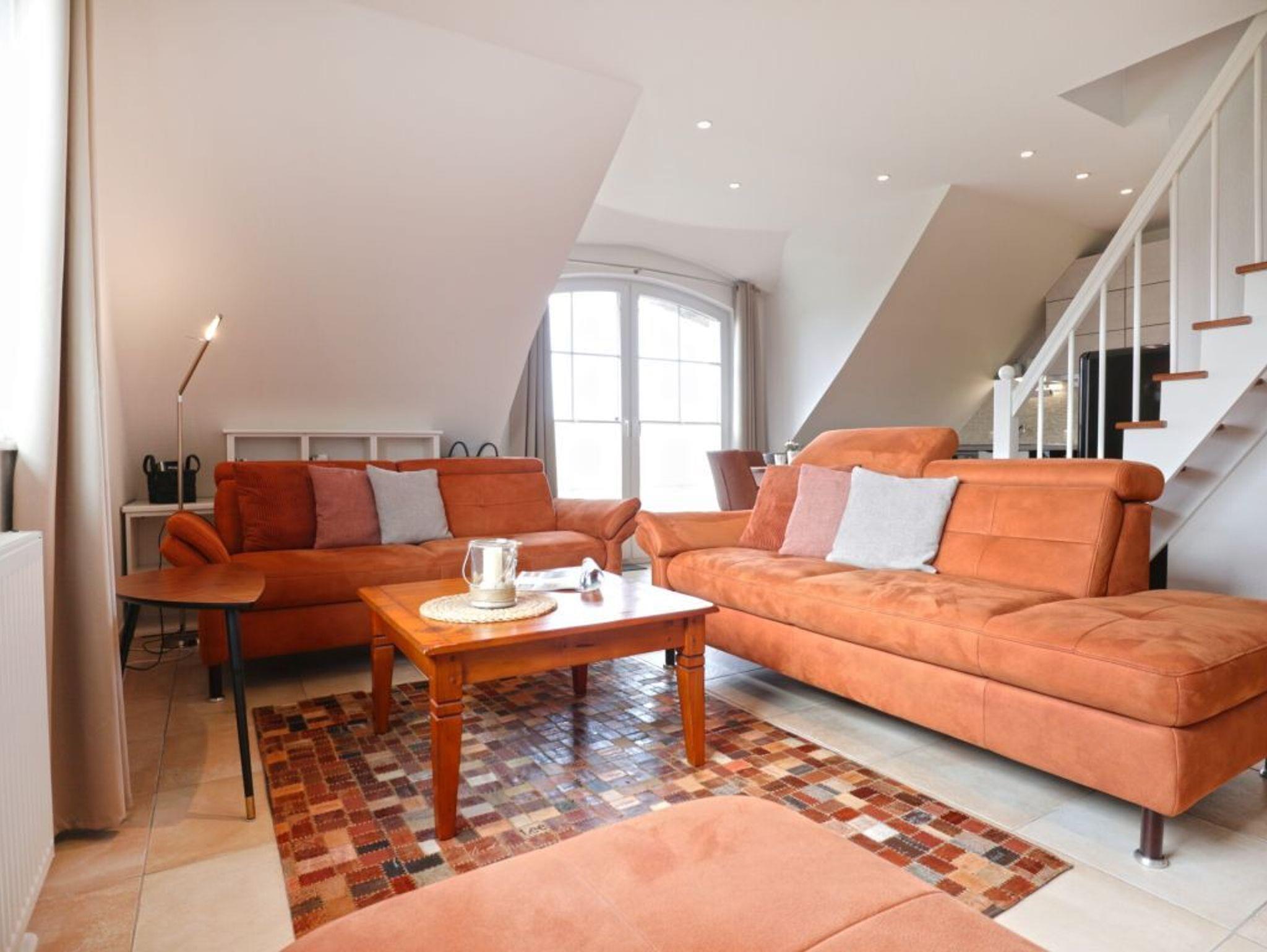 Die hochwertig ausgestattete Maisonette-Wohnung bietet mit ihren 65 qm genügend Platz für bis zu 4 Personen. Das Wohnzimmer mit Gas-Kaminofen, SAT-TV und integrierter Küche empfängt sie in auf 1. Ebene. Des Weiteren befinden sich dort ein Schlafzimmer, Badezimmer mit ebenerdiger Dusche und ein Abstellraum. Über eine Raumspartreppe gelangen sie zu dem weiteren Schlafzimmer auf der 2. Ebene, dass mit einem weiteren TV mit DVD und einer HiFi-Anlage ausgestattet ist. Ein Gäste-WC ist auf der Ebene vorhanden. Der Balkon der Wohnung in Süd-/ Westlage bietet Ihnen den ganzen Tag Sonne.