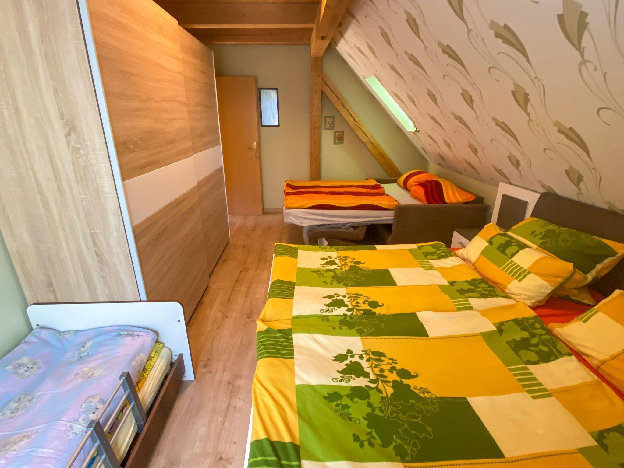 Die Ferienwohnung befindet sich im Obergeschoss und besteht aus einem Wohnzimmer mit angrenzendem Kochbereich, zwei Schlafzimmern und einem Bad mit Dusche und WC. Das erste Schlafzimmer verfügt über ein Doppelbett (180x200; getrennte Matratzen) und Schlafsofa (130x200, Aufbettung für 2 Personen) und das zweite Schlafzimmer über ein Doppelbett (140x200). Für Kinder bis 3 Jahre kann ein Kinderbett (60x120) zur Verfügung gestellt werden.