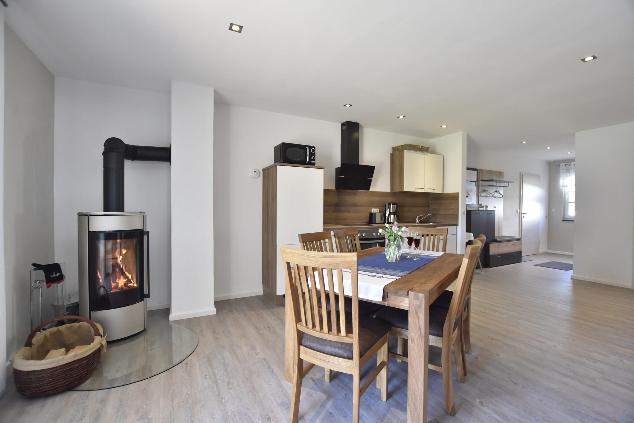 Parterre: (offene Küche(Wasserkocher, Toaster, Kochherd(Ceranfeld), Kaffeemaschine, Backofen, Mikrowelle, Spülmaschine, Kühl-/Gefrierkombination), Wohn/Esszimmer(Doppelschlafcouch, TV(Flatscreen), Esstisch, Kaminofen, Gesellschaftsspiele), Schlafzimmer(Doppelbett king size(180 x 200 cm)), Schlafzimmer(Etagenbett(90 x 200 cm)), Badezimmer(Dusche(ebenerdige Dusche), Waschbecken, Toilette)) 2. Gästeunterkunft Parterre: (offene Küche(Wasserkocher, Toaster, Kochherd(Ceranfeld), Kaffeemaschine, Backofen, Mikrowelle, Spülmaschine, Kühl-/Gefrierkombination), Wohn/Esszimmer(Doppelschlafcouch, TV(Flatscreen), Esstisch, Kaminofen), Schlafzimmer(Doppelbett king size(180 x 200 cm)), Badezimmer(Dusche(ebenerdige Dusche))) Waschraum(Waschmaschine), Grill, Babybett, Terrasse, Garten(umzäunt), Fahrradabstellraum, Gartenmöbel, Grill, Hochstuhl