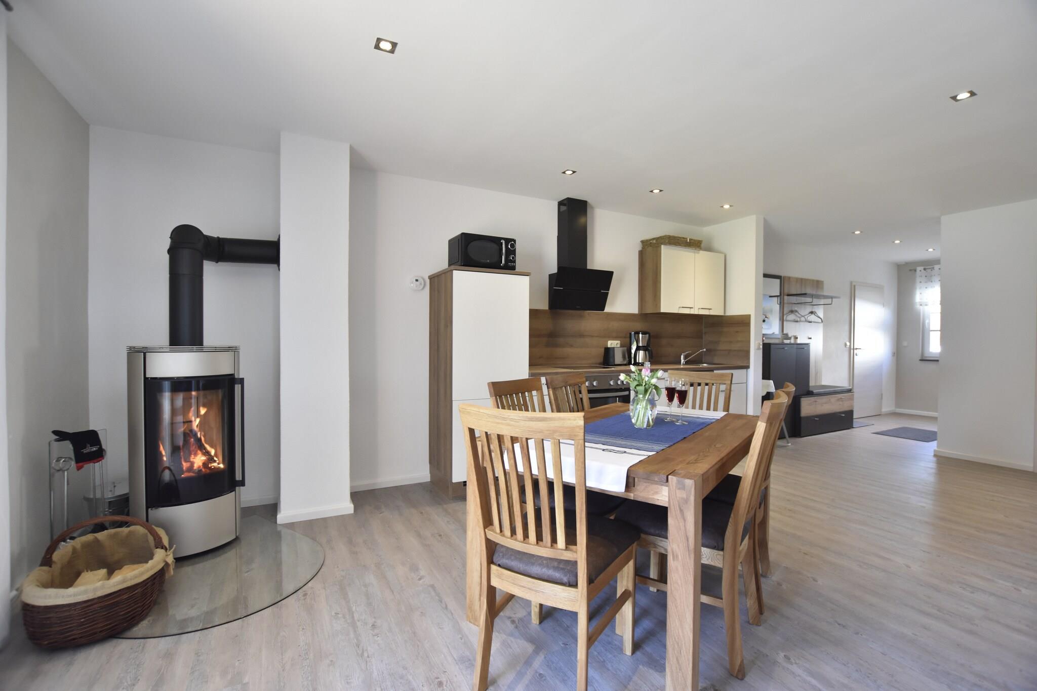 Parterre: (offene Küche(Wasserkocher, Toaster, Kochherd(Ceranfeld), Kaffeemaschine, Backofen, Mikrowelle, Spülmaschine, Kühl-/Gefrierkombination), Wohn/Esszimmer(Doppelschlafcouch, TV(Flatscreen), Esstisch, Kaminofen, Gesellschaftsspiele), Schlafzimmer(Doppelbett king size(180 x 200 cm)), Schlafzimmer(Etagenbett(90 x 200 cm)), Badezimmer(Dusche(angepasst für Behinderte, ebenerdige Dusche), Waschbecken, Toilette(angepasst für Behinderte)), Waschraum(Waschmaschine)) Grill, Babybett, Terrasse, Garten, Fahrradabstellraum, Gartenmöbel, Grill, Hochstuhl