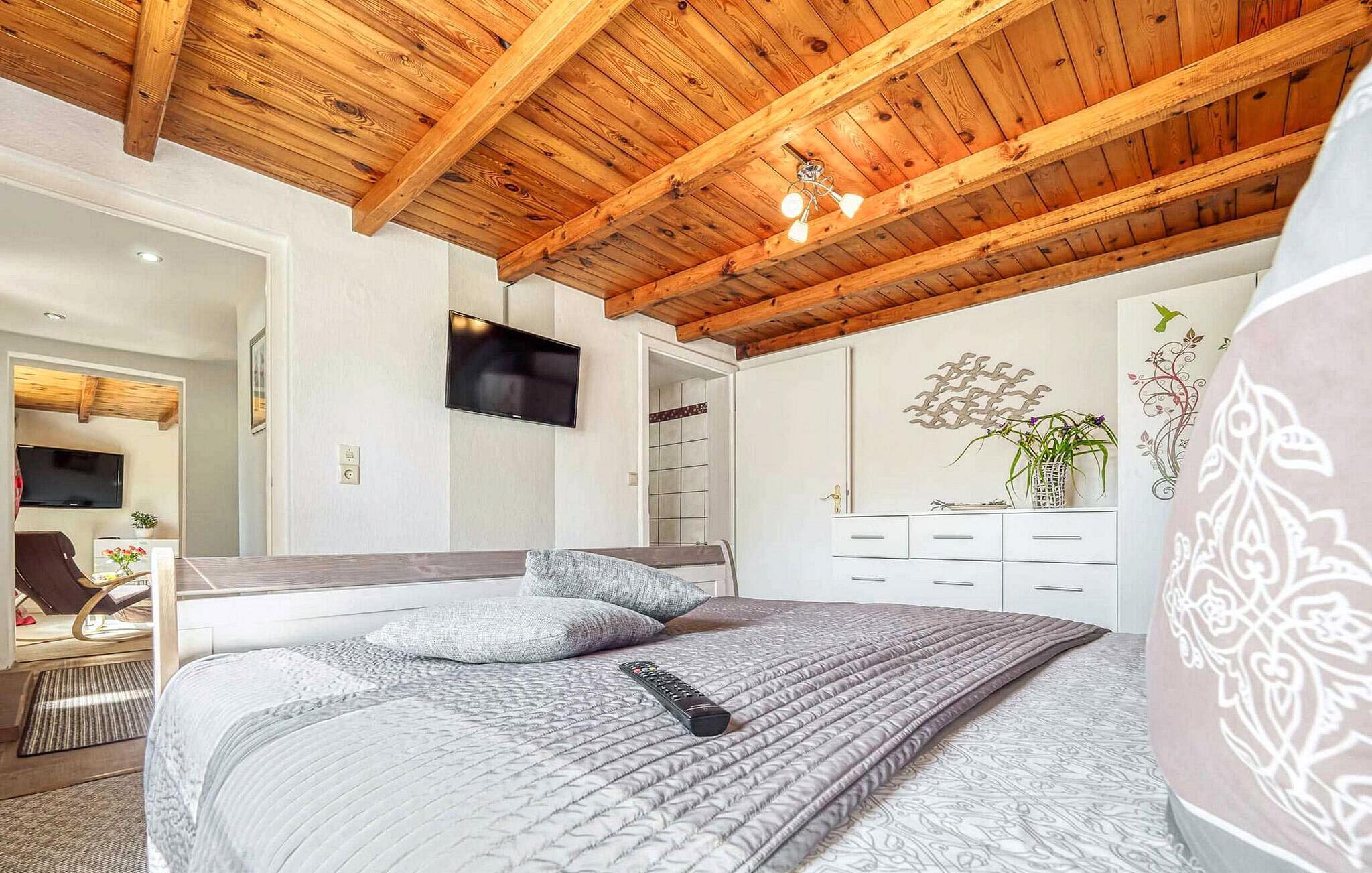 Das ca. 45 qm große, geschmackvoll eingerichtete und zentral beheizte Ferienhaus verfügt über einen Wohnraum (Polstermöbel, Flachbild-TV, Radio, kleiner Esstisch) mit offenem Küchenbereich (Cerankochfeld, Kühlschrank mit Gefriermöglichkeit, Minibackofen, diverse Küchenkleingeräte), einen Schlafraum (Doppelbett, Flachbild-TV, Insektenschutz) sowie ein Bad (Dusche, WC).