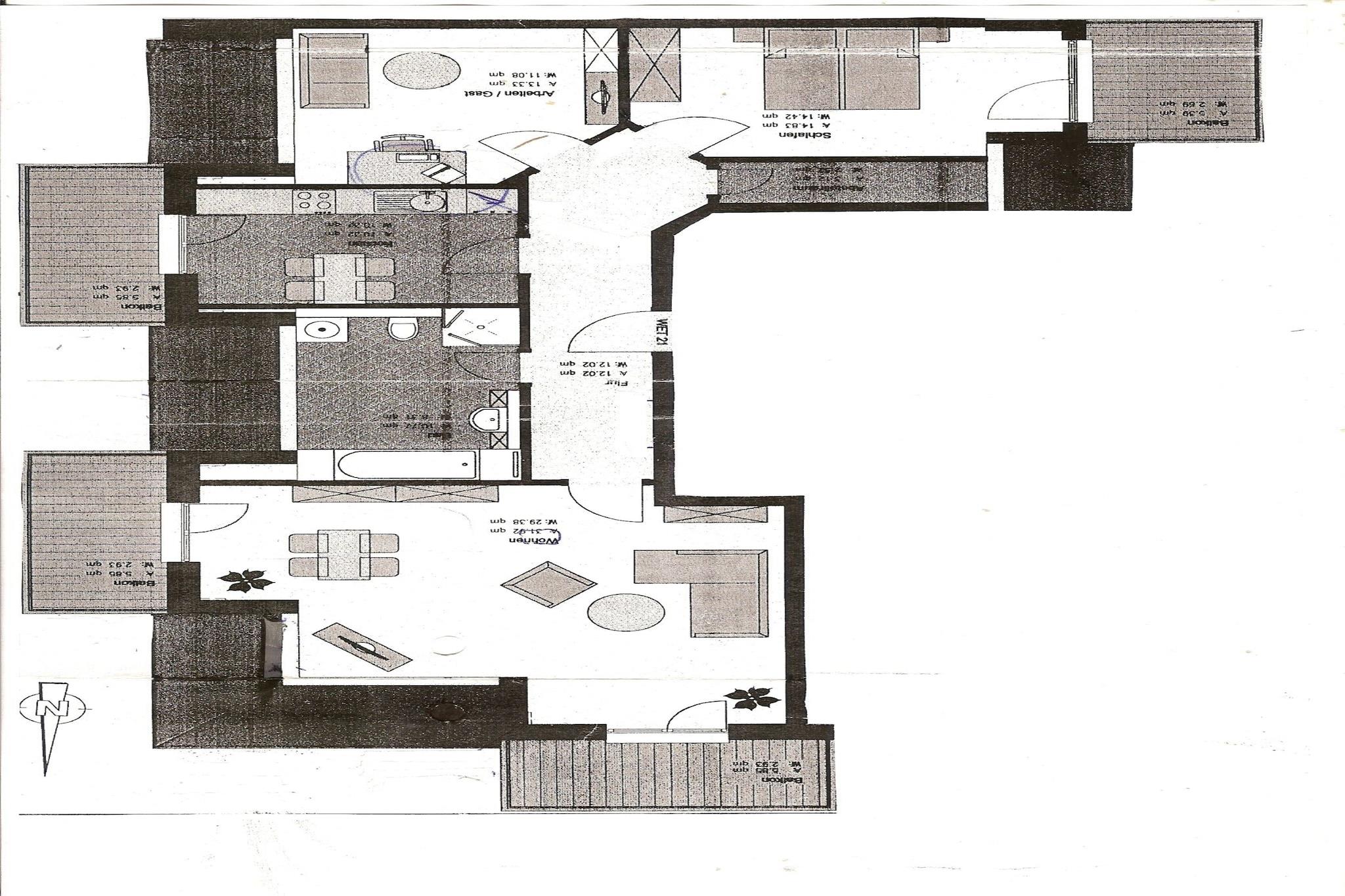 Dachgeschoss: (Wohnzimmer(TV, DVD-Spieler, Radio, CD-Spieler, 2x Balkon), Küche(Kochherd(4 Kochplatten, Ceranfeld), Backofen, Spülmaschine, Kühlschrank(+ Gefrierfach), Balkon), Schlafzimmer(Doppelbett king size, Balkon), Schlafzimmer(Doppelbett king size), Badezimmer(Badewanne, Dusche(ebenerdige Dusche), Toilette, Föhn), Flur, Aufzug, Kinderbett, Hochstuhl) Esstisch, Fahrradabstellraum, Parkplatz, Föhn
