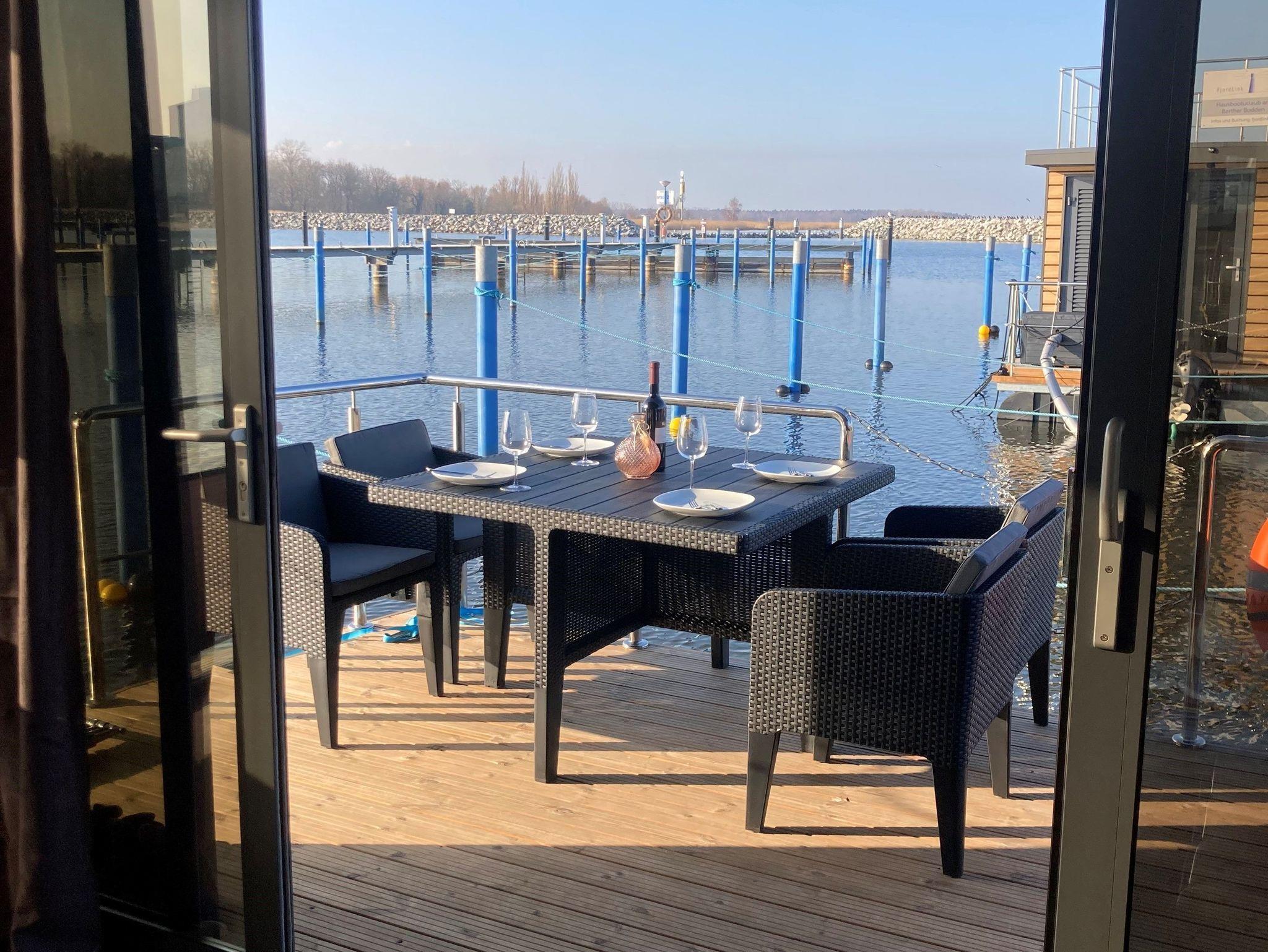 Genießen Sie Komfort und Entspannung auf dem modernen Hausboot Fjord Vineta mit Sauna und Sonnenterrassen am Barther Bodden.
