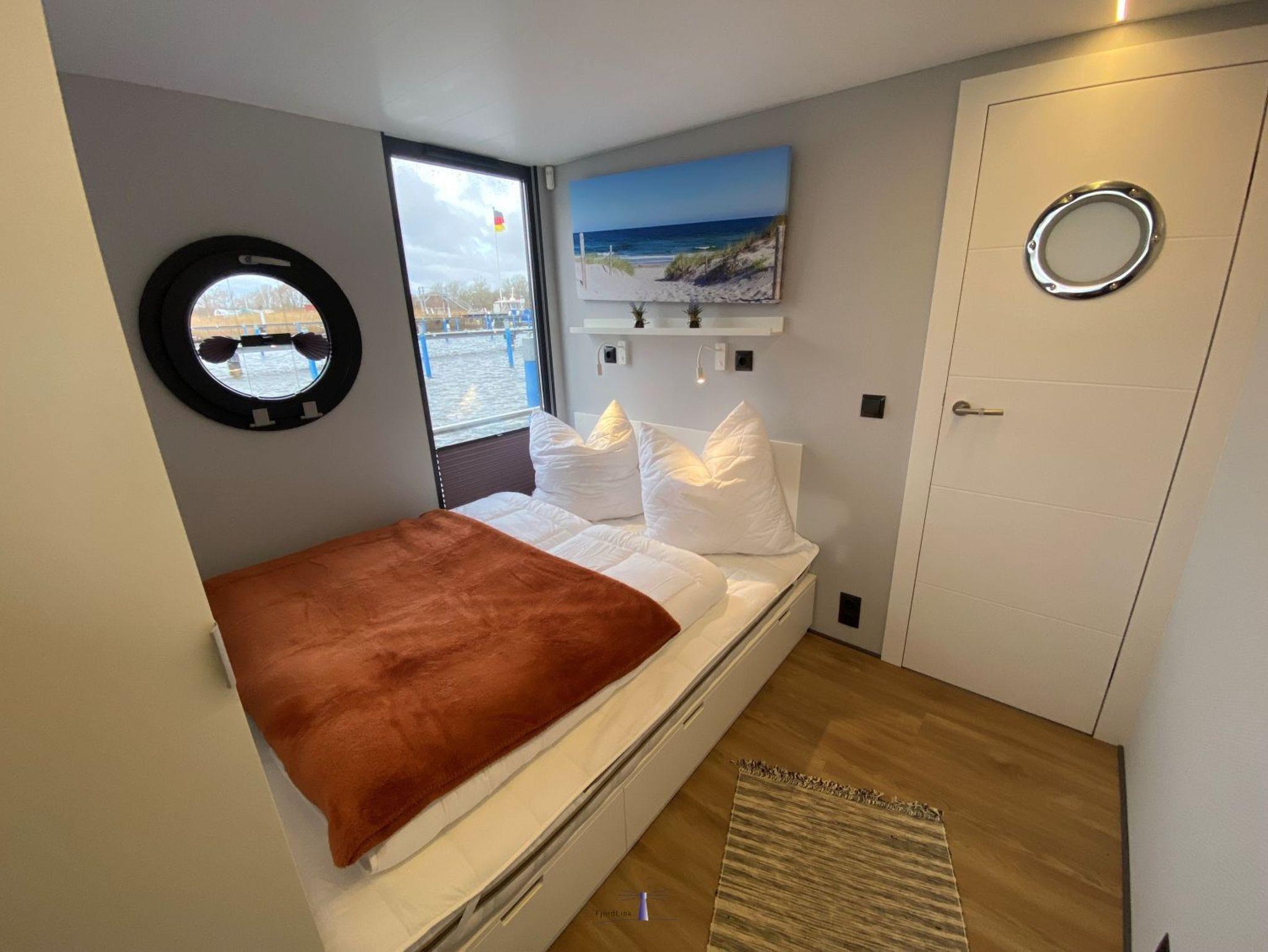 Im Inneren des Hausbootes finden Sie neben dem Wohnraum mit Fußbodenheizung für kalte Tage zwei Schlafräume mit je einem Doppelbett sowie ein modernes Duschbad. Genügend Stauraum finden Sie in den Schränken sowie in den Schubladen unter den Betten.