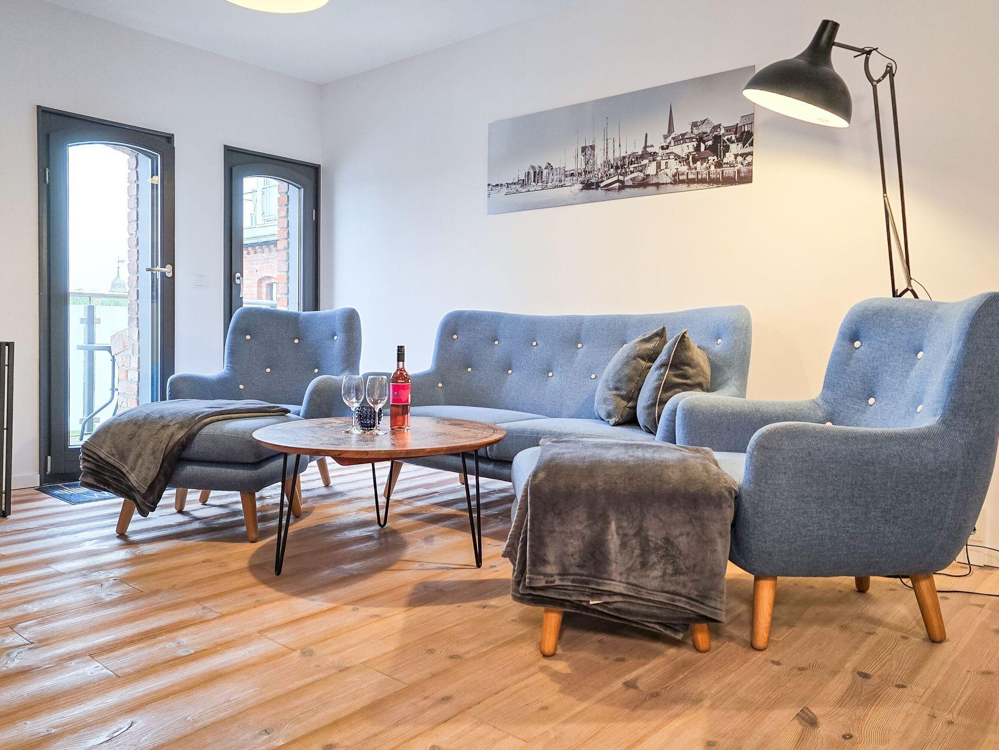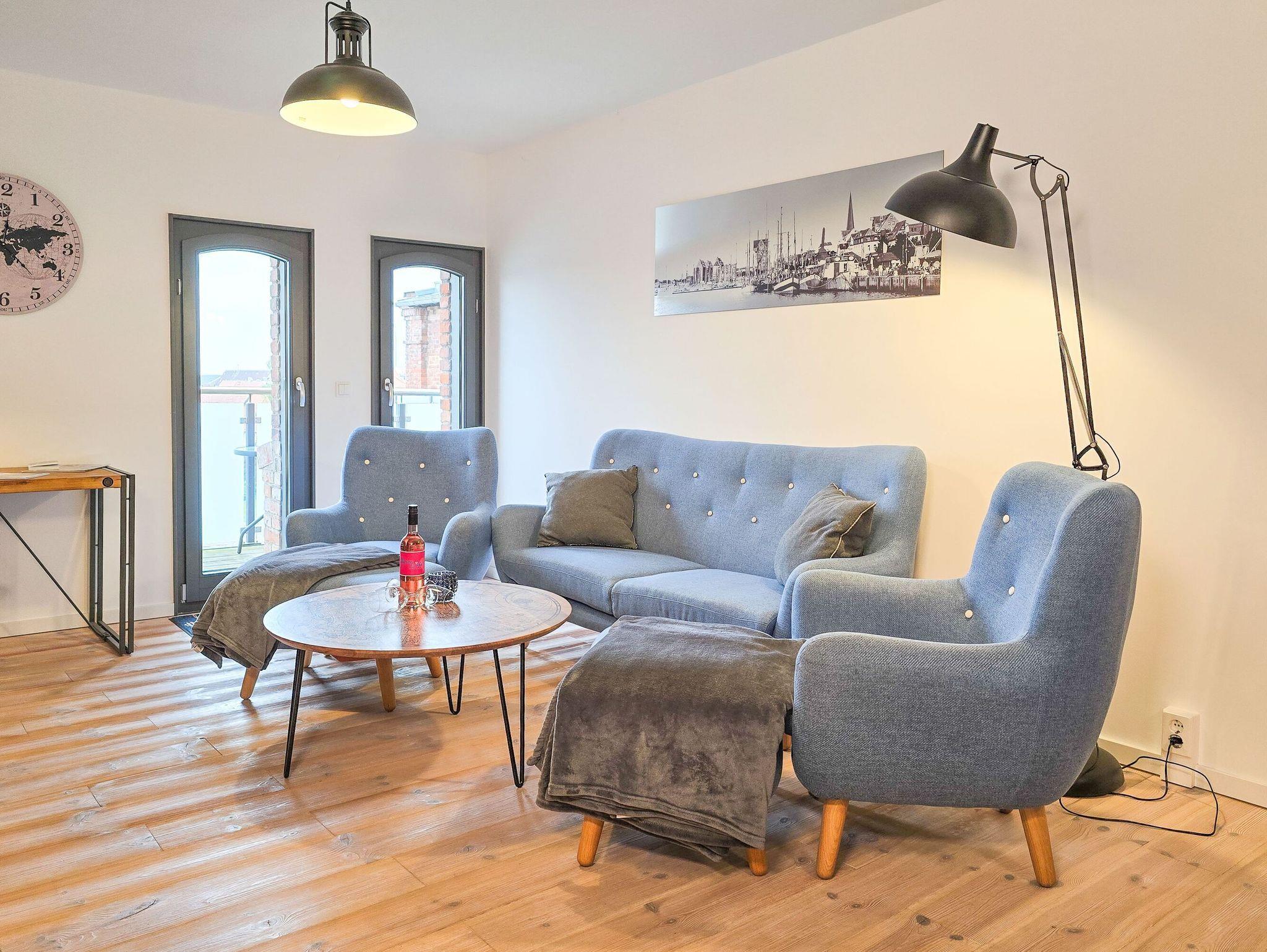 Großzügiges Nichtraucherapartment mit Balkon und Blick auf die Altstadt in Barth, ideal für Familien und Haustiere.