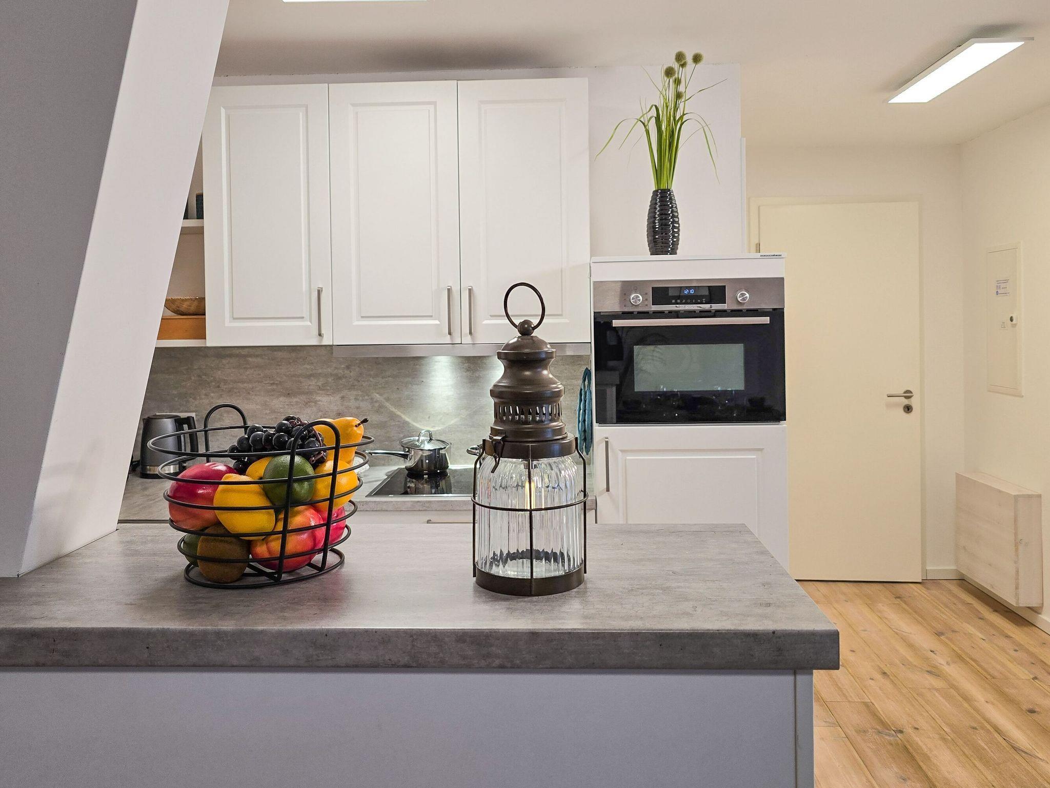• Küche: Voll ausgestattete Küchenzeile mit Backofen, Kochfeld, Mikrowelle, Kühlschrank, Gefriermöglichkeit, Geschirrspüler, Filterkaffeemaschine, Toaster und Wasserkocher
