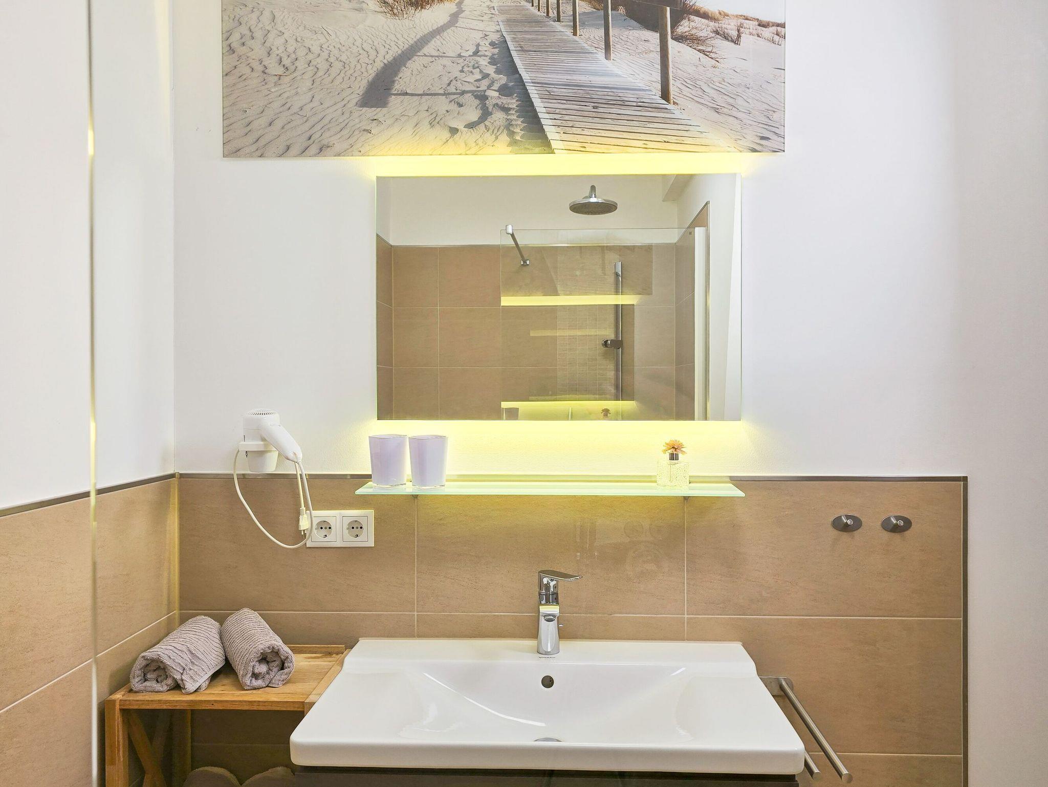 • Badezimmer: Modernes Bad mit ebenerdiger Dusche, Regendusche, Handtuchtrockner und Haartrockner