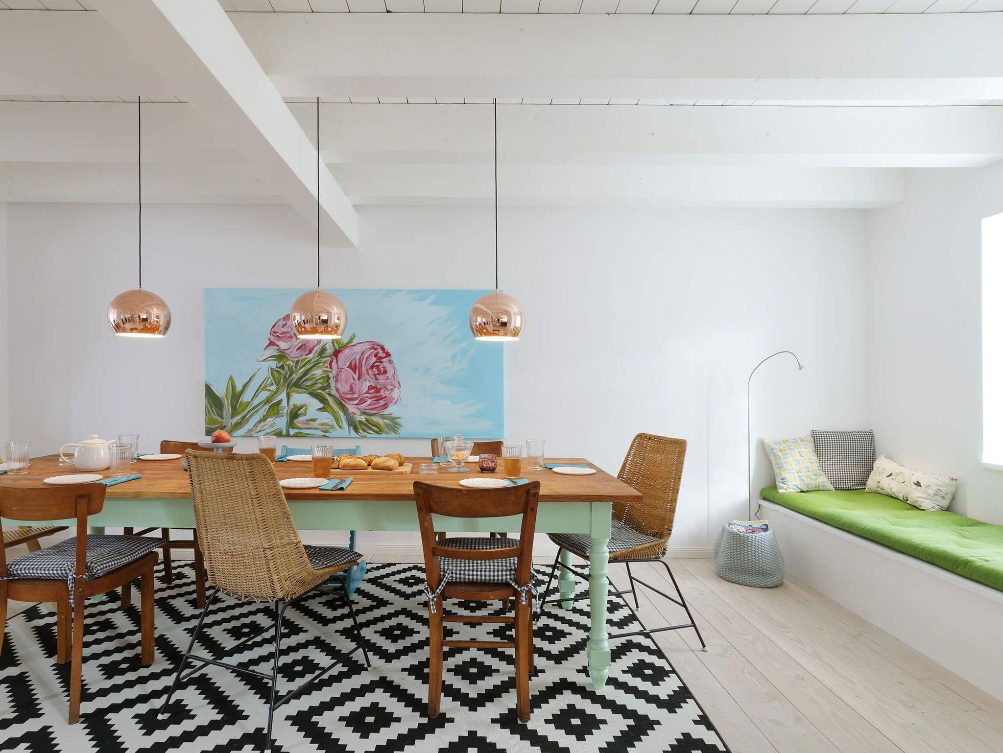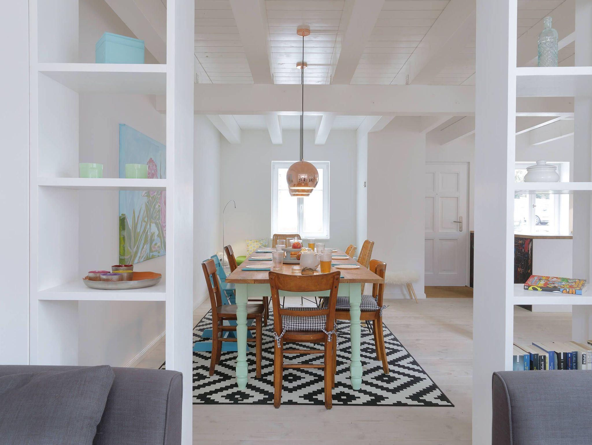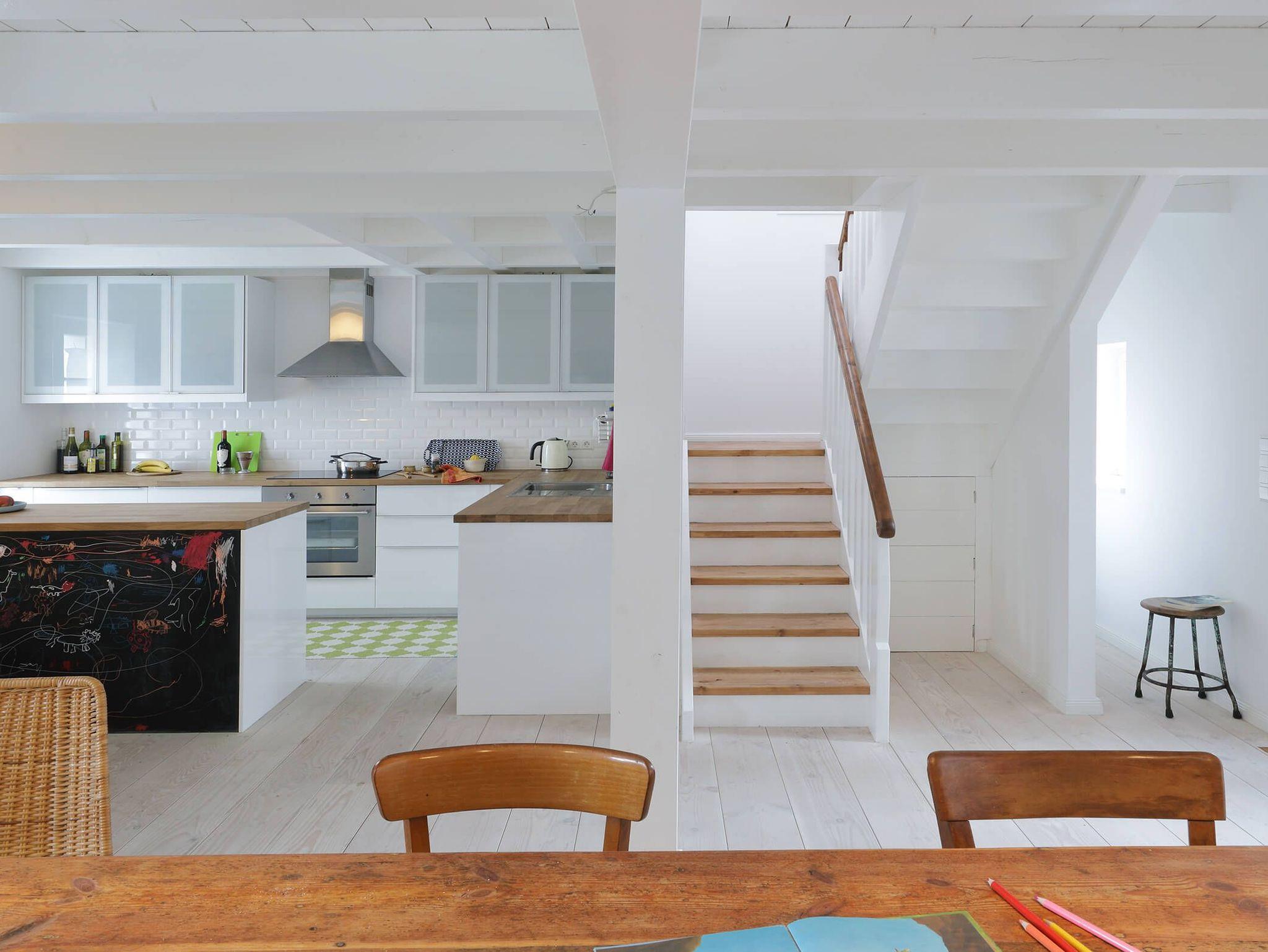 Die offene Wohnküche ist ein Ort, an dem kreative Köpfe an einer großen Tafel zusammenkommen können. Der Kamin sorgt für gemütliche Abende und eine besondere Atmosphäre im Durchgangszimmer, das ebenfalls als Schlafzimmer genutzt werden kann.
