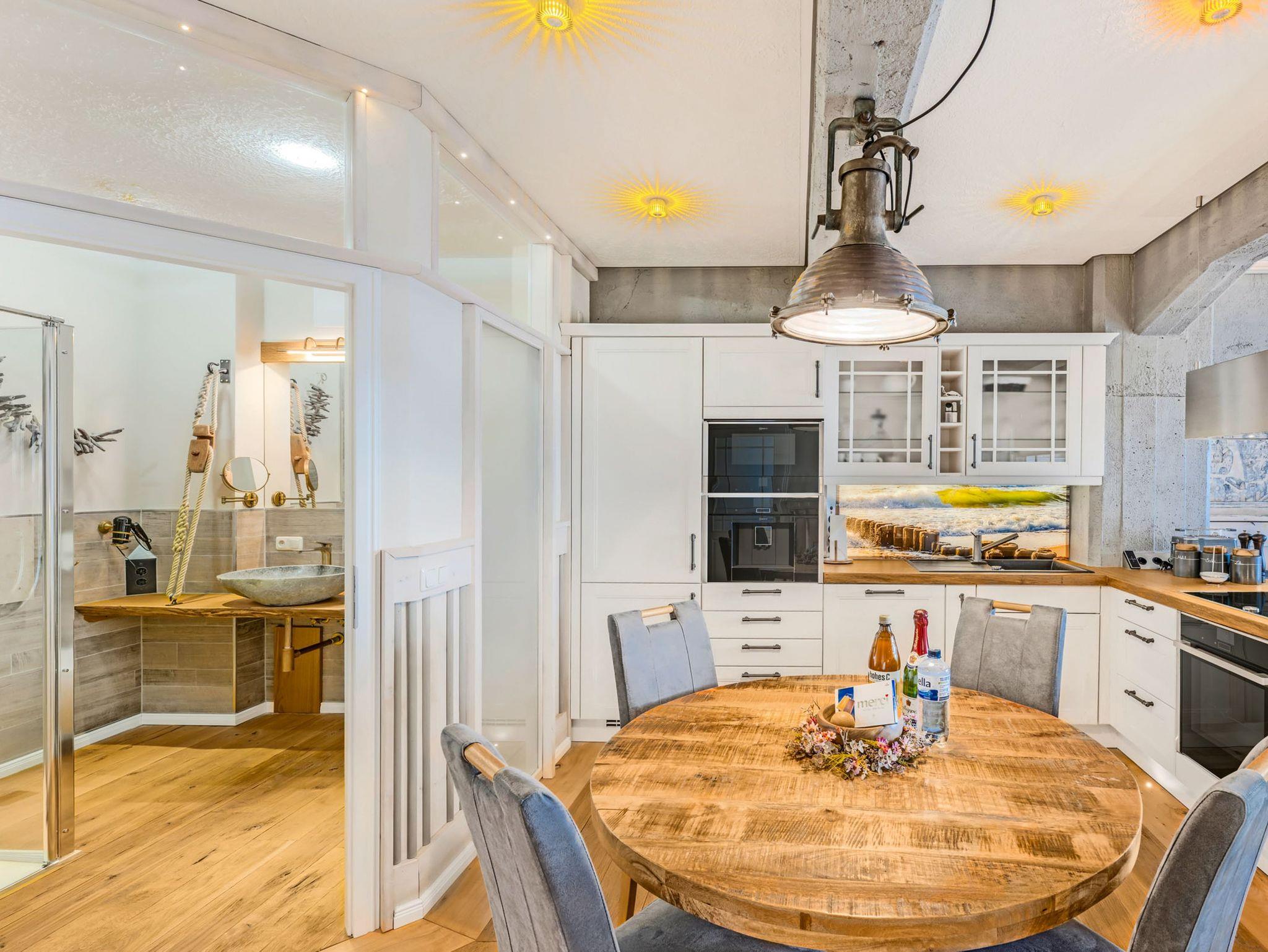 Die Ferienwohnung Lütt Haven überzeugt durch eine klare Raumaufteilung, hochwertige Materialien und ein stimmiges maritimes Wohnkonzept. Der offene Wohn- und Essbereich bildet das Zentrum der Wohnung. Eine großzügige Couch, ein großer TV und der direkte Zugang zum Balkon laden zum Entspannen ein. Mit Blick auf den Hafen und das ruhige Treiben am Wasser kannst du hier ein stärkendes Frühstück genießen oder einen erlebnisreichen Tag ausklingen lassen. Für entspannte Abende steht dir kostenfreies Streaming zur Verfügung, das du ganz unkompliziert nutzen kannst. Die offene Küche ist hochwertig ausgestattet und bietet dir mit großem Kochfeld, Backofen, Mikrowelle, Spülmaschine, Kühlschrank und Kaffeevollautomat alles, was du für genussvolle Mahlzeiten benötigst.