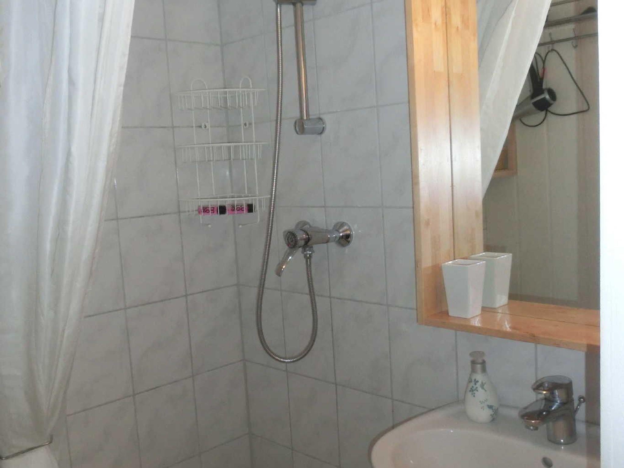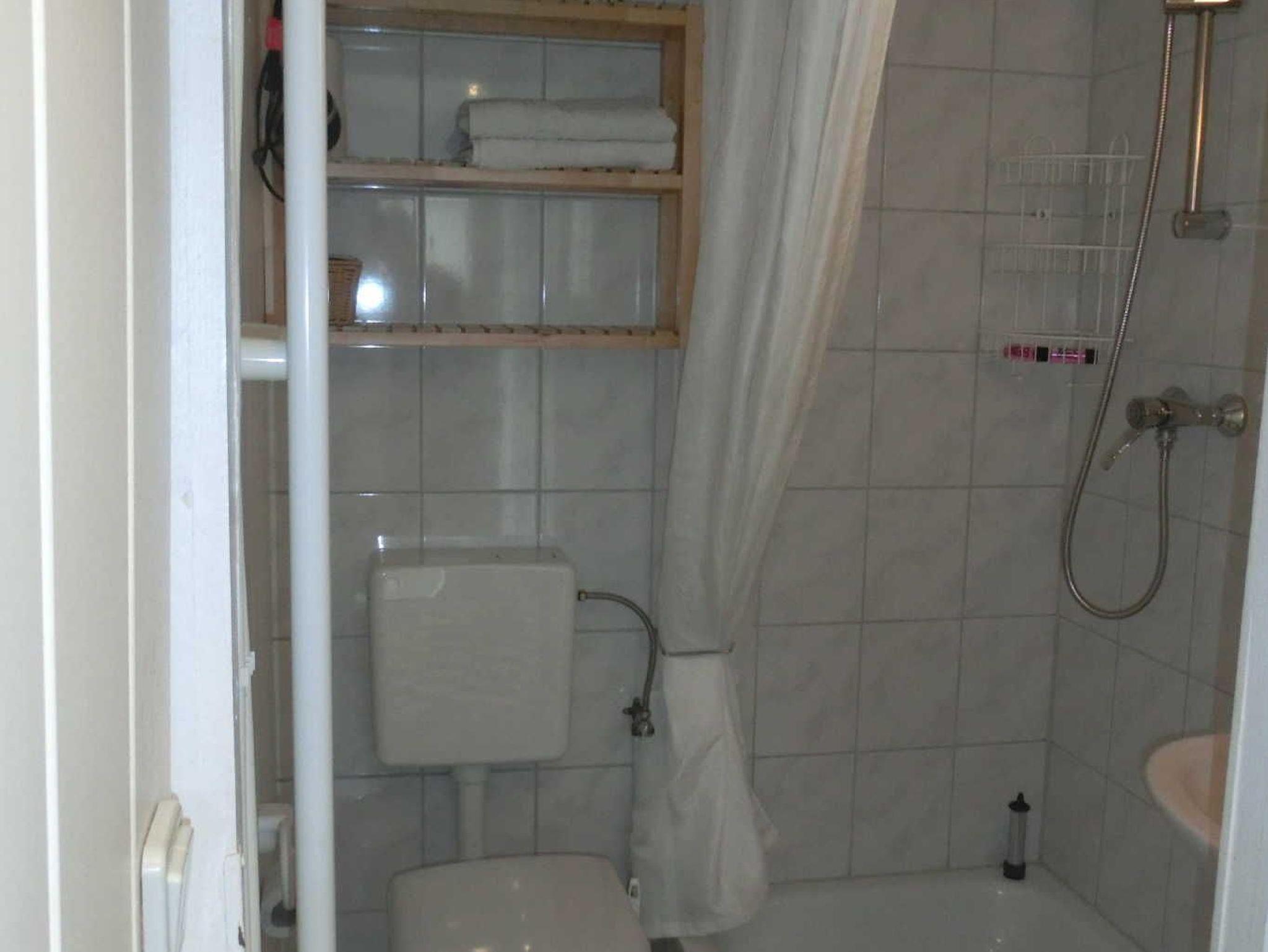 Bad mit Dusche, WC, Ablage für persönliche Utensilien.