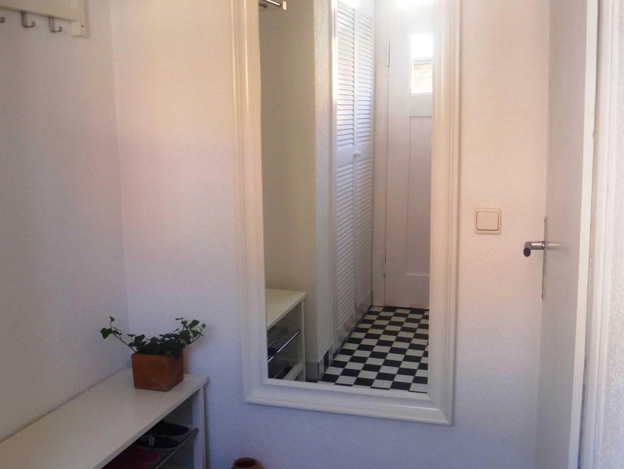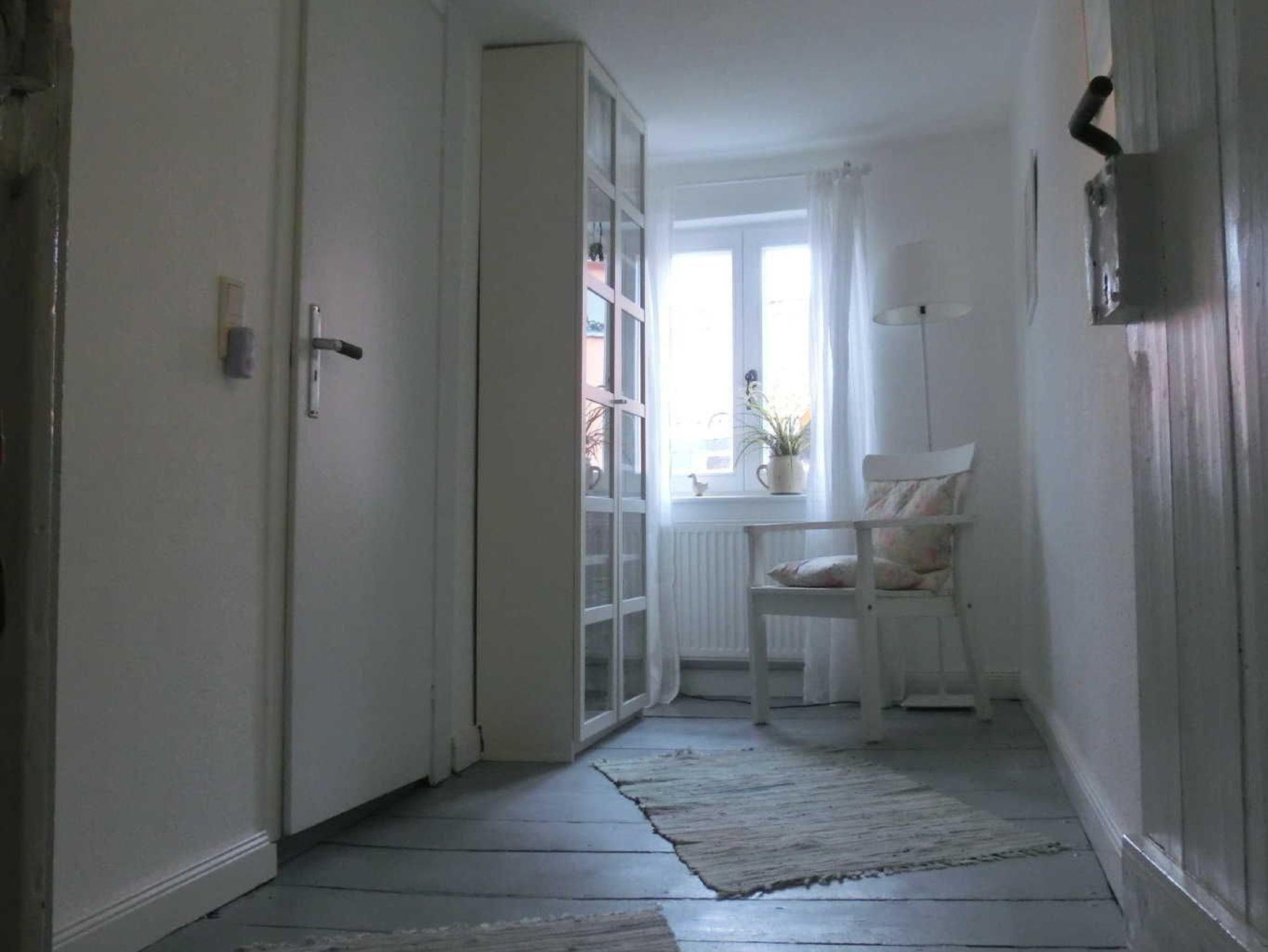 Hausflur unten mit großem Spiegel, Garderobe und Schuhablage, Leseecke im Flur oben. Zwei Räder für Erwachsene und 1 Kinderrad stehen zur Verfügung.