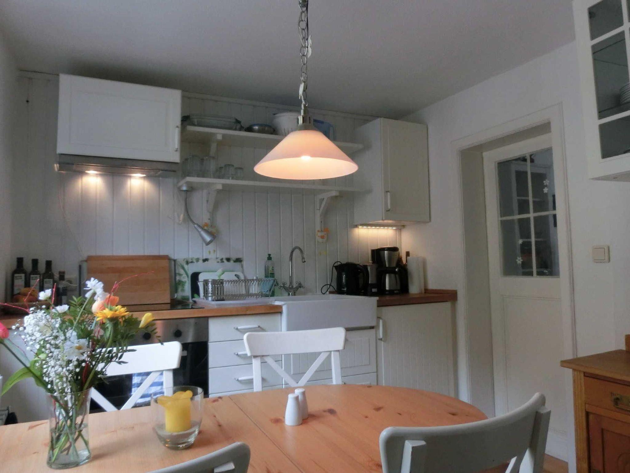 Komplett eingerichtete Küche mit großem ausklappbaren Esstisch, Spüle, Kühl,- und Gefrierkombination, Wasserkocher, Toaster, Kaffeemaschine, 4 Induktionskochfelder, Porzellan, Gläser, Besteck, Töpfe, Bügeleisen, Geschirr- und Küchentücher.