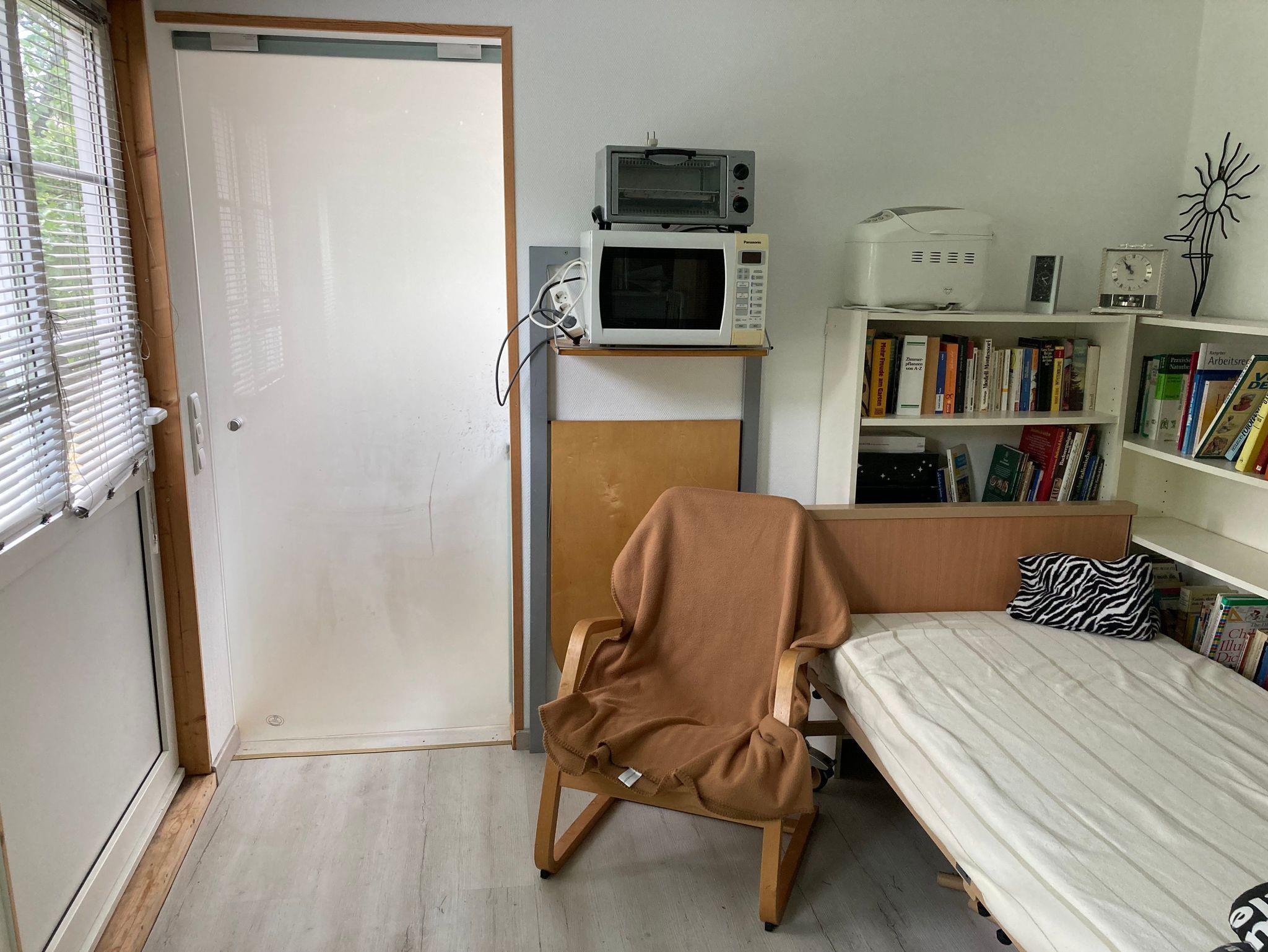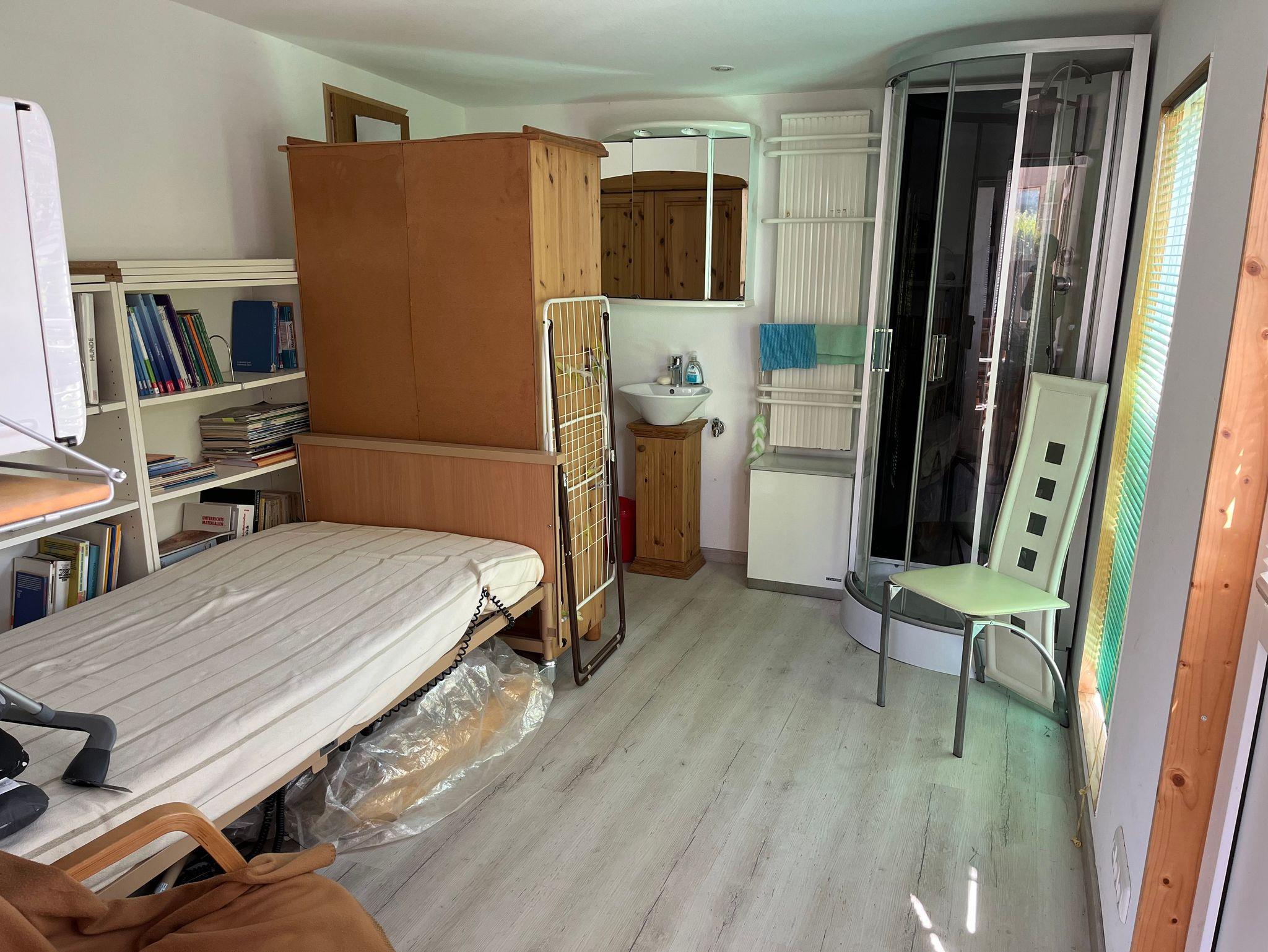 der Nähe des Dusch-/WC-Bereichs befindet sich ein Pflegebett (0,90 m x 2 m), das das durch eine