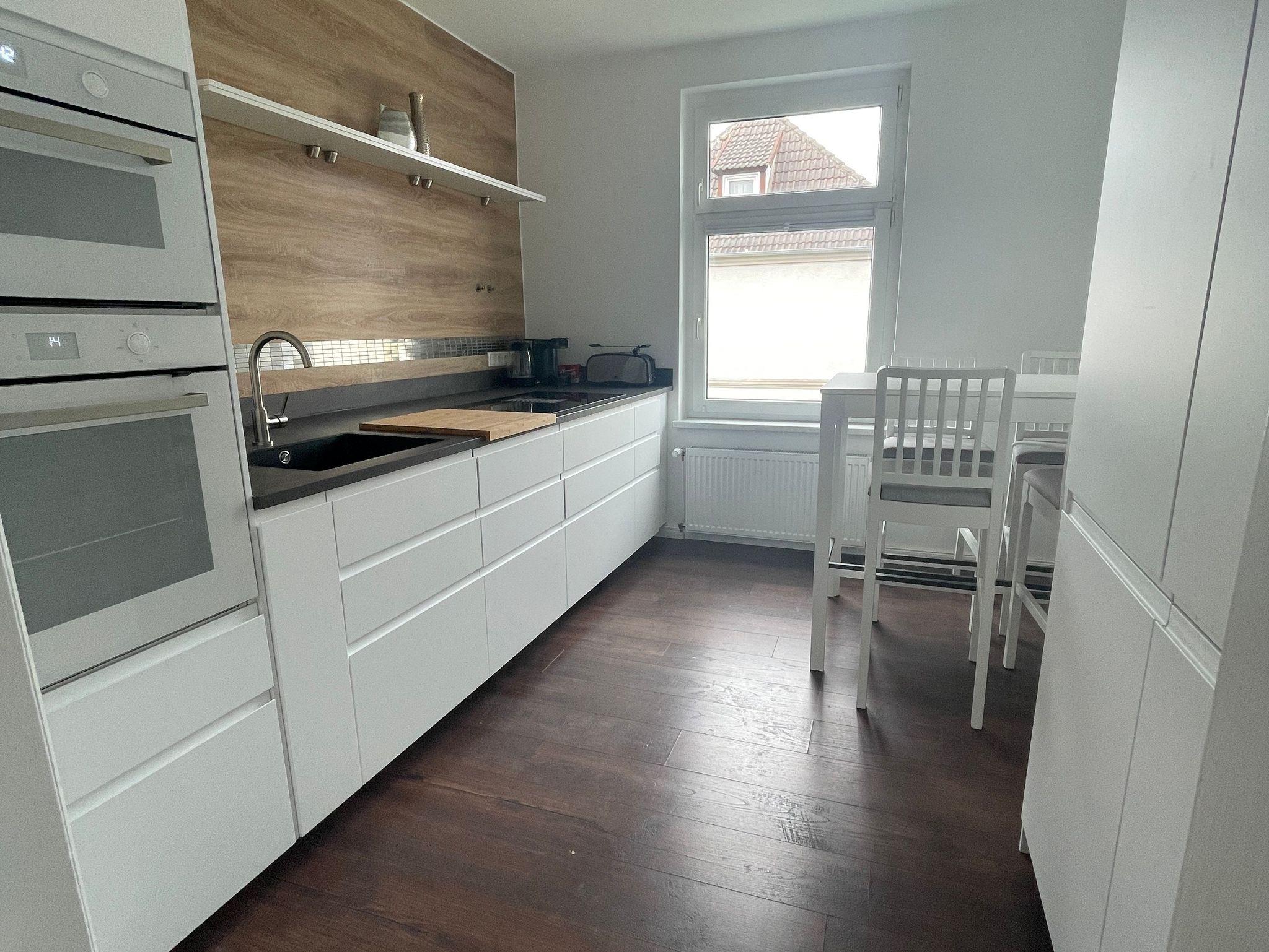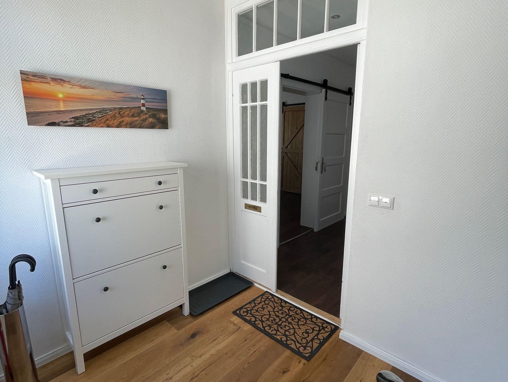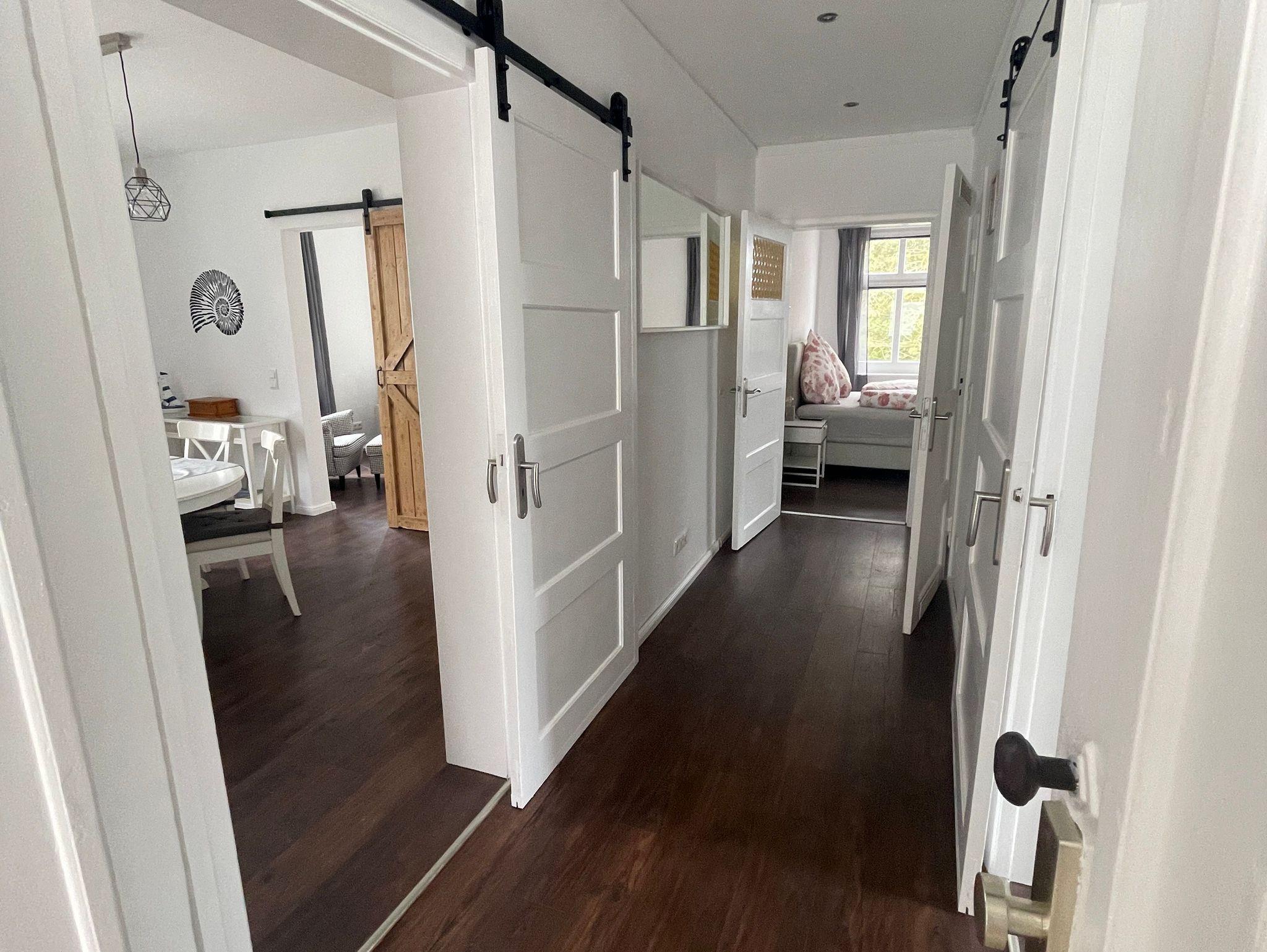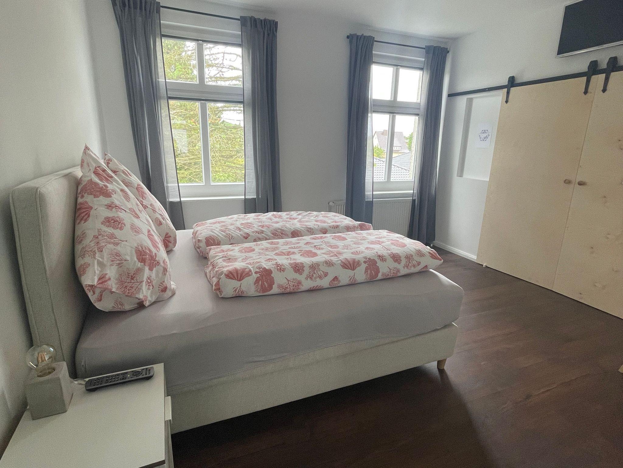 Gesellschaftsspiele, Krimis und Romane liegen bereit. Im Hauptschlafzimmer befindet sich ein 1,80 x 2,00 m großes Boxspringbett und ein begehbarer Kleiderschrank, sowie ein Bügelbrett und Bügeleisen. Im zweiten Schlafzimmer befindet sich zwei 0,90 x 2,00 m Betten, sowie zwei Kleiderschränke und ein kleiner Schreibtisch mit Stuhl. Im Wohnzimmer befindet sich neben dem großen L-förmigen Sofa, auch ein Ohrensessel mit Beinhocker. Das Tageslichtbad ist ausgestattet mit einer 0,86 x 1,30 m großen Dusche mit niedriger Einstiegshöhe und Handtuchheizkörper. Außerdem befindet sich dort auch ein WC, sowie ein großer Waschtisch mit Spiegel und Föhn. Die einzelnen Räume sind über den zentralen Wohnungsflur erreichbar. Die gesamte Wohnung ist (außer Bad) mit einem dunklen Laminatboden ausgestattet und eine Nichtraucherwohnung. Die Wohnräume sind nach Westen ausgerichtet und verfügen über sehr viel Tageslicht. Über 25 Stufen ist die Wohnung im 1. Obergeschoss erreichbar.