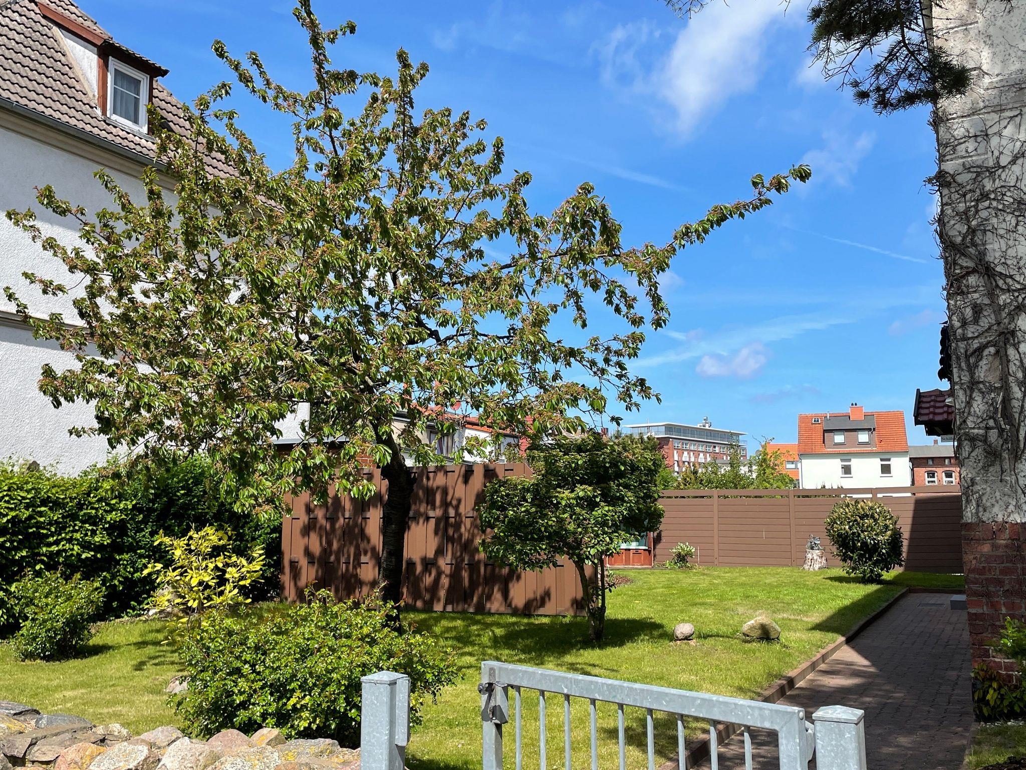 Der Garten liegt in östlicher Richtung und schützt den möglichen Aufenthaltsbereich durch einen Sichtschutz. Hier befindet sich auch der Strandkorb und die Aufnahme für die Wäschespinne. Die abschließbare Garage beherbergt einen Gasgrill, Gartenmöbel und die Wäschespinne. Dort besteht auch die Möglichkeit Fahrräder sicher unterzubringen. Im Kellergeschoss, mit ca. 1,70 m Deckenhöhe, befindet sich außerdem noch eine Waschmaschine, sowie ein Trockner. Es steht ein Stellplatz vor der Garageneinfahrt, sowie die öffentlichen Parkbuchten zur Verfügung.