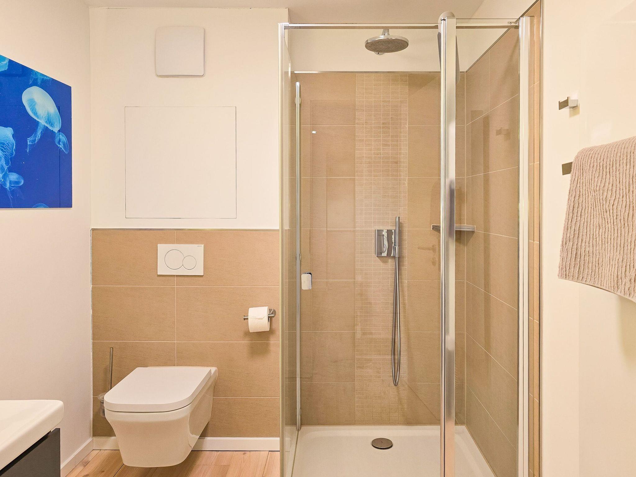Das Speicherresidenz App. Sonnenparadies I - 4.7 empfängt Sie mit einer einladenden Atmosphäre. Auf dem Balkon genießen Sie die Sonne ab Mittag bis zum faszinierenden Sonnenuntergang. Der Wohnbereich mit Sitzgruppe und Essplatz lädt zu gemütlichen Abenden ein. In der separaten, voll ausgestatteten Küche können Sie Ihre Lieblingsgerichte zubereiten, die Sie anschließend auf dem Balkon mit seitlichem Boddenblick genießen können. Das Schlafzimmer bietet komfortable Ruhe und hochwertige Boxspringbetten, während das moderne Badezimmer mit ebenerdiger Regendusche zusätzlichen Komfort bietet. Im Sommer genießen Sie die erfrischende Klimaanlage im Wohn- und Schlafzimmer.