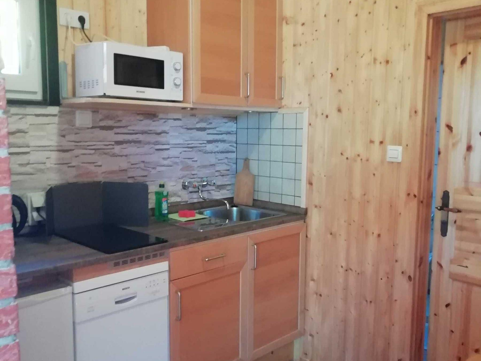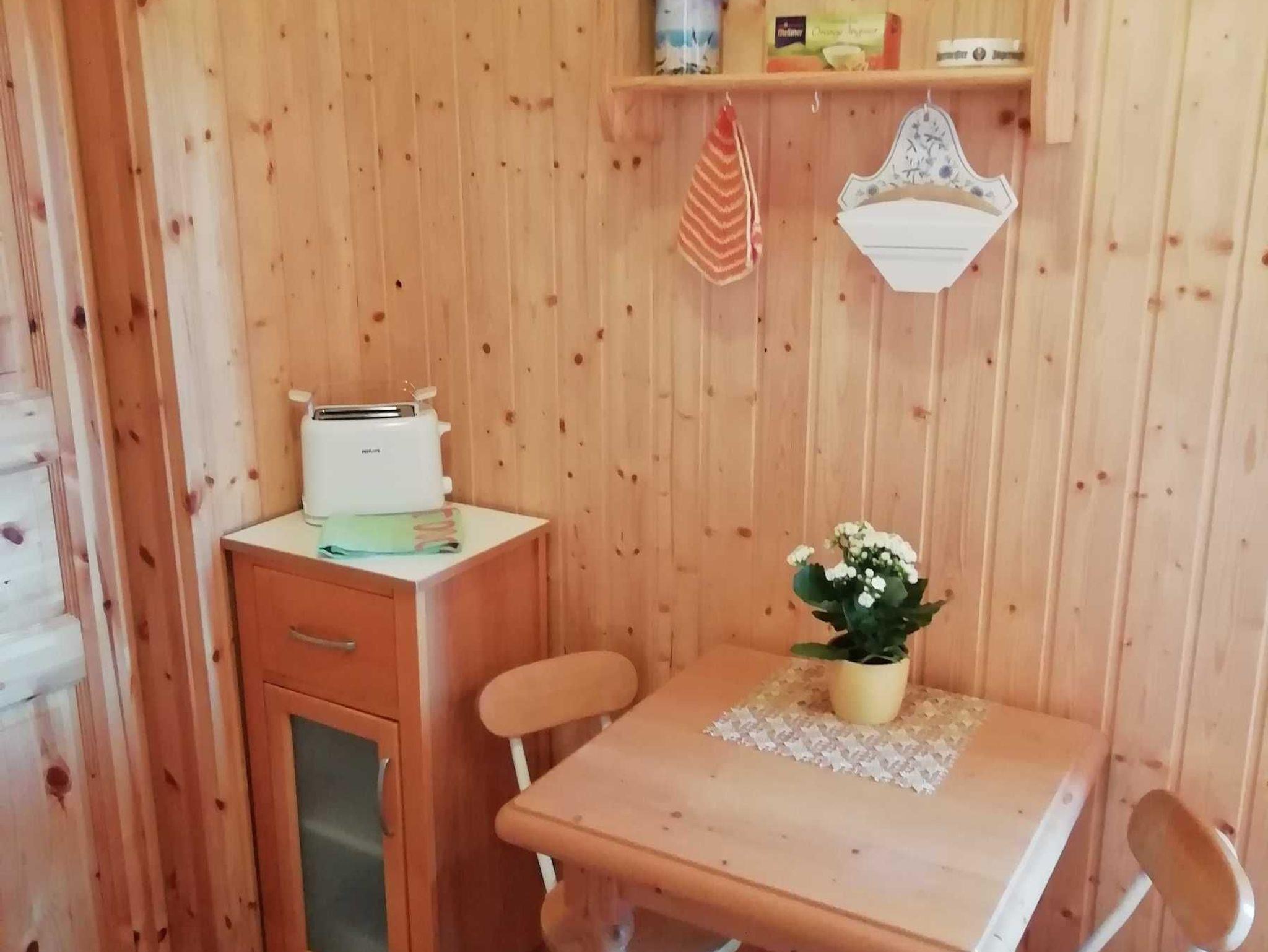 Im Wohnzimmer befindet sich ein Doppelbett für zwei Personen und ein Kamin. Zusätzlich gibt es einen abgeschlossenen Schlafraum mit zwei Einzelbetten. Die Eßecke grenzt an das Wohnzimmer. Neben der separaten Küchenzeile befindet sich eine abgeschlossene Dusche mit WC.