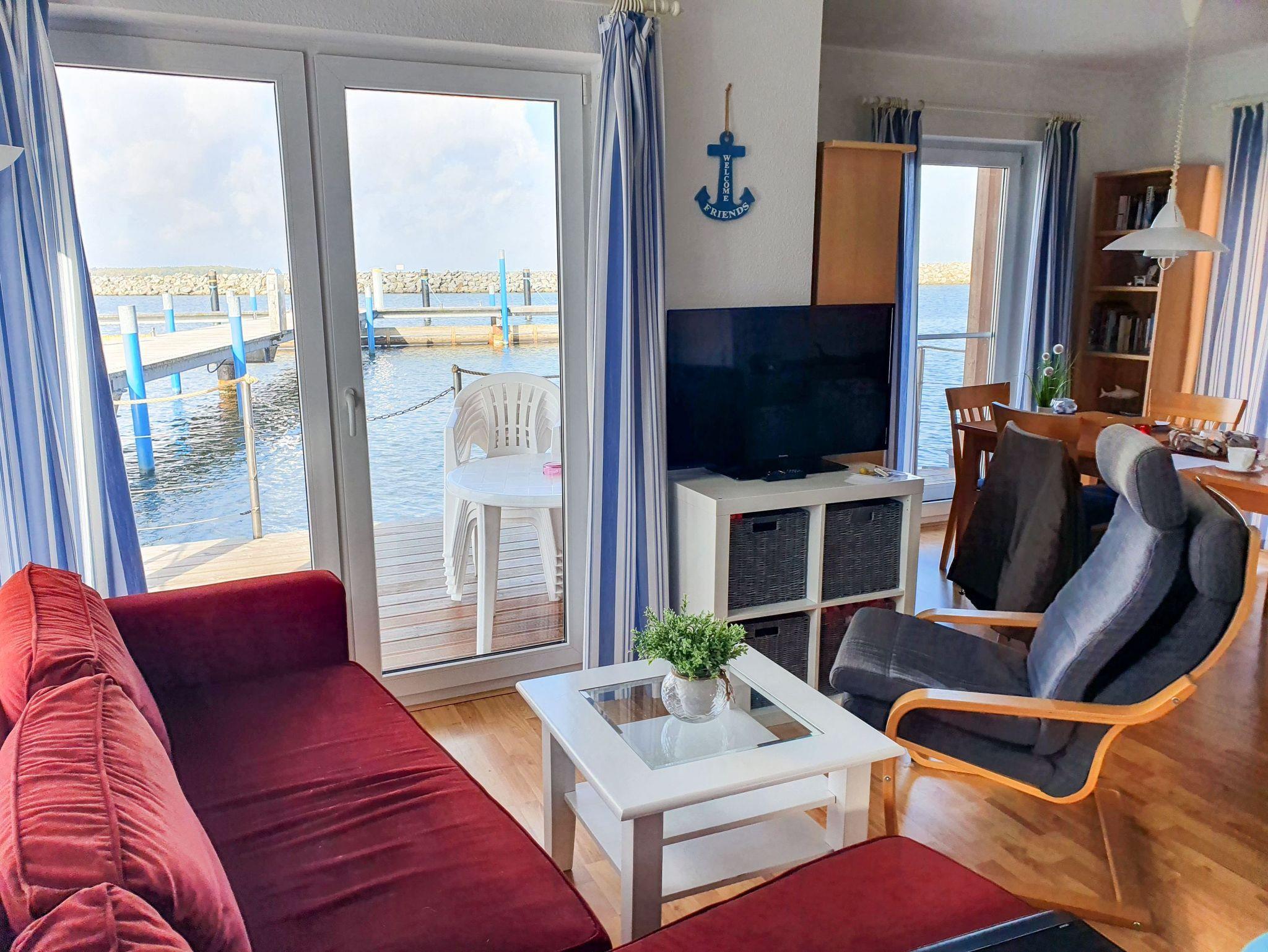 Erleben Sie maritimen Urlaub auf dem schwimmenden Hausboot mit Seeblick im Hafen von Barth.