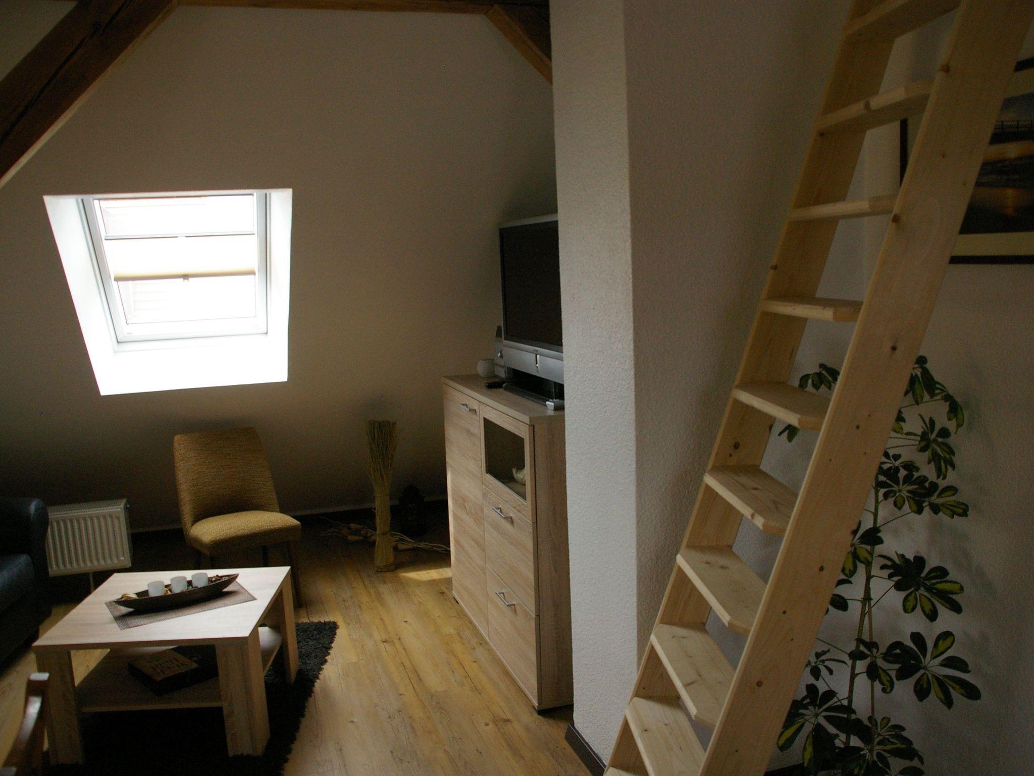 Das Wohnzimmer ist bis zur Spitze ausgebaut (keine Zwischendecke) mit einer kleinen Galerie die als kleine Lese-Galerie oder ggf. auch als Schlafplatz nutzbar wäre.