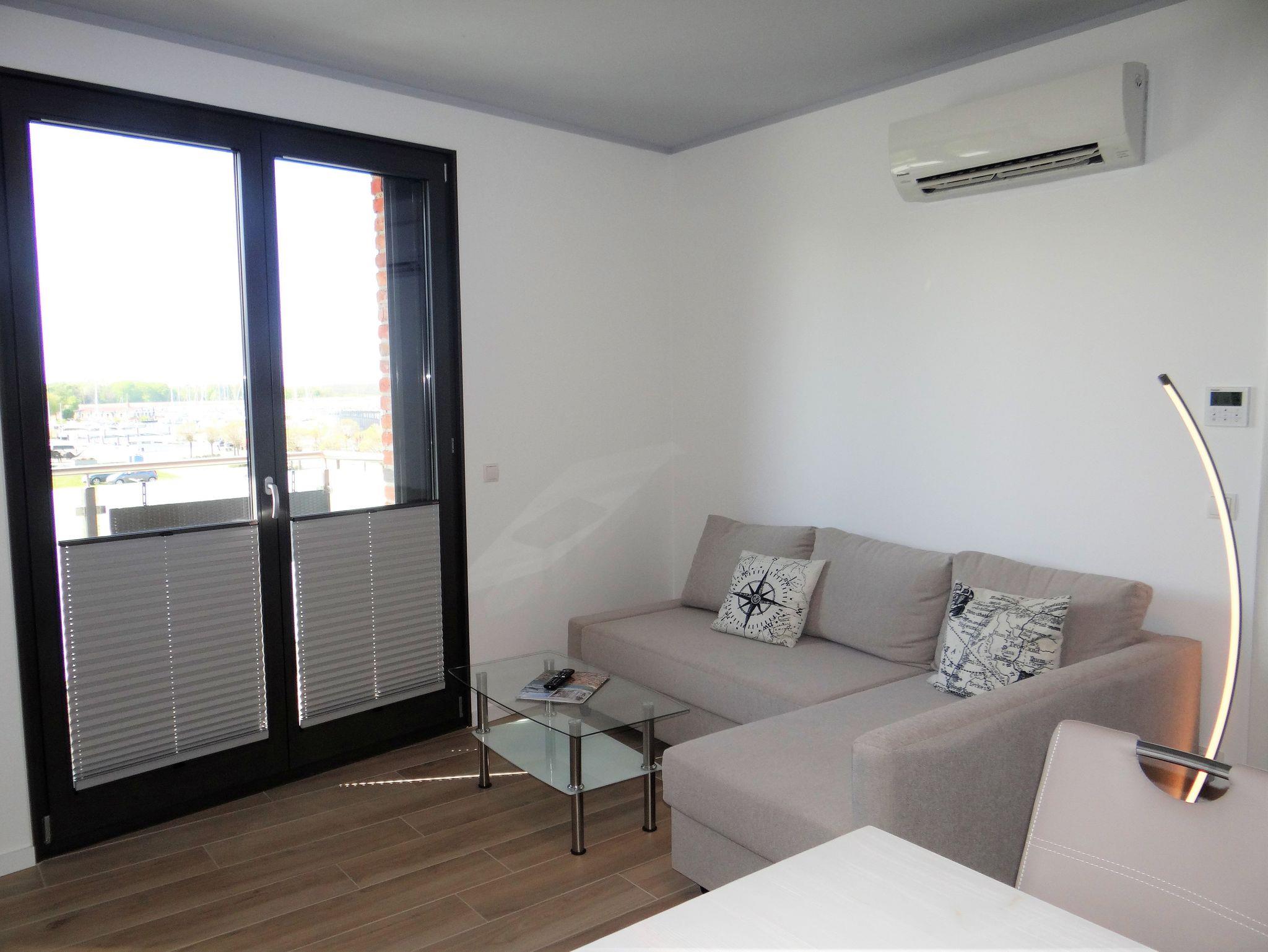 Schlafzimmer mit Boddenblick, Wohnzimmer mit Balkon, Esstisch mit Durchreiche zur offenen Einbauküche mit hochwertiger Küchenausstattung; Kaffeeautomat (Bohnen und Pulver), Backofen inkl. Mikrowelle und Grillfunktion, Geschirrspüler. Bad mit großer ebenerdiger Dusche, Klimaanlage,