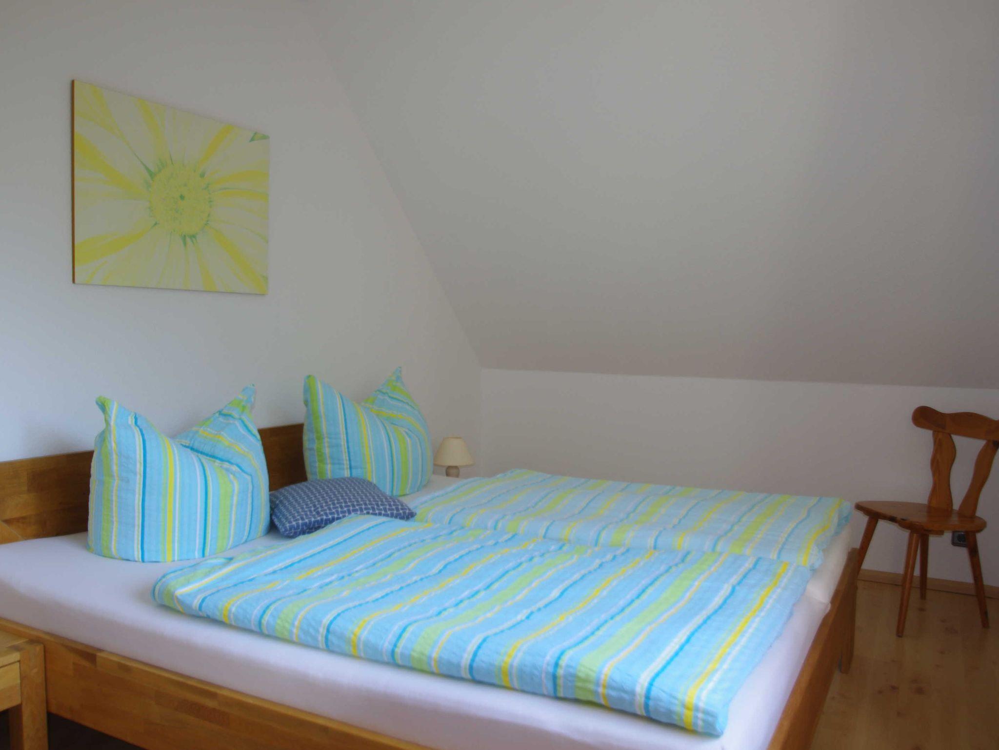 Die Dachgeschoßwohnung mit 65 qm Wohnfläche für 2-4 Personen besteht aus einem Wohnzimmer, 2 Schlafzimmern mit Doppelbetten (Kinderbett, Kinderstuhl, vorhanden auf Anfrage), komplett eingerichtete Küche, Bad mit Dusche/WC. Der Balkon mit Tisch, Stühlen und Sonnenschirm ist vom Wohnzimmer aus begehbar. Die Wohnung ist mit TV, Radio (CD,DVD) Fön und WLAN ausgestattet. Im Garten ist ein Bereich zum Sonnen, Grillen und Spielen. PKW Parkplatz und Unterstellmöglichkeit für Fahrräder ist vorhanden.