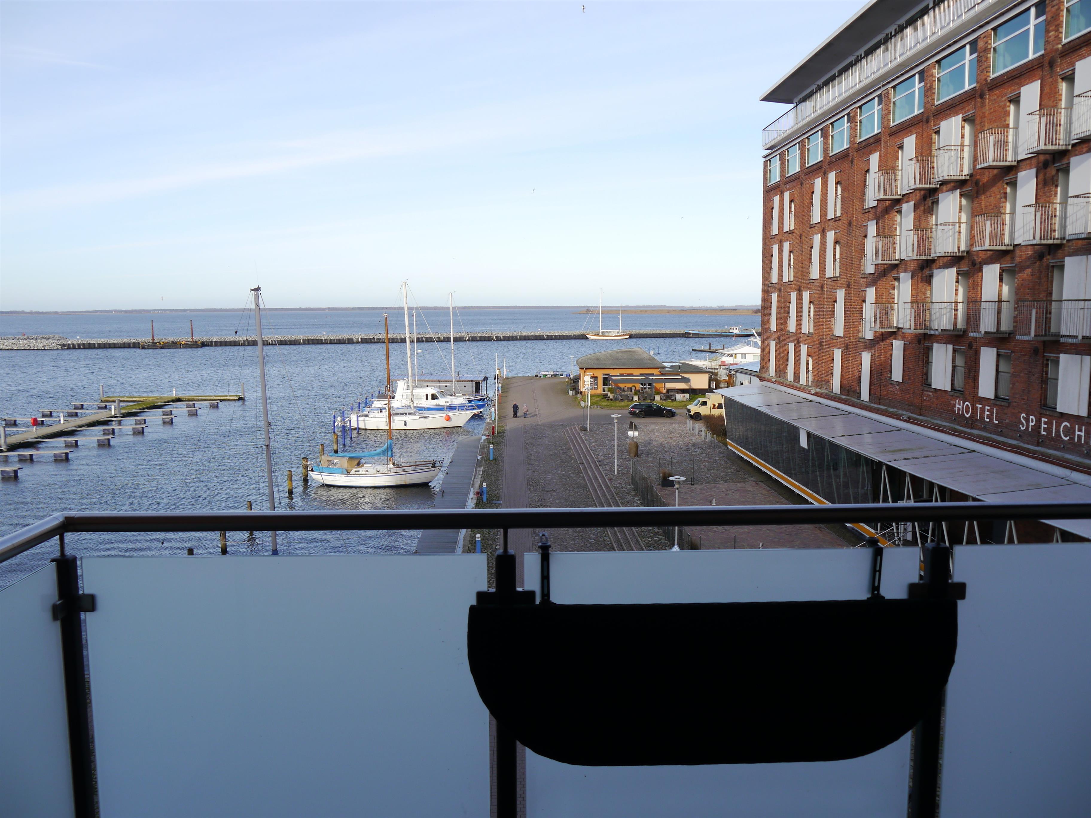 Vom Wohnbereich gelangen Sie auf Ihren Balkon, von dem Sie einen tollen Blick auf die Halbinsel Fischland-Darß-Zingst haben. In den Sommermonaten genießen Sie wunderschöne Sonnenuntergänge über dem Barther Hafen.