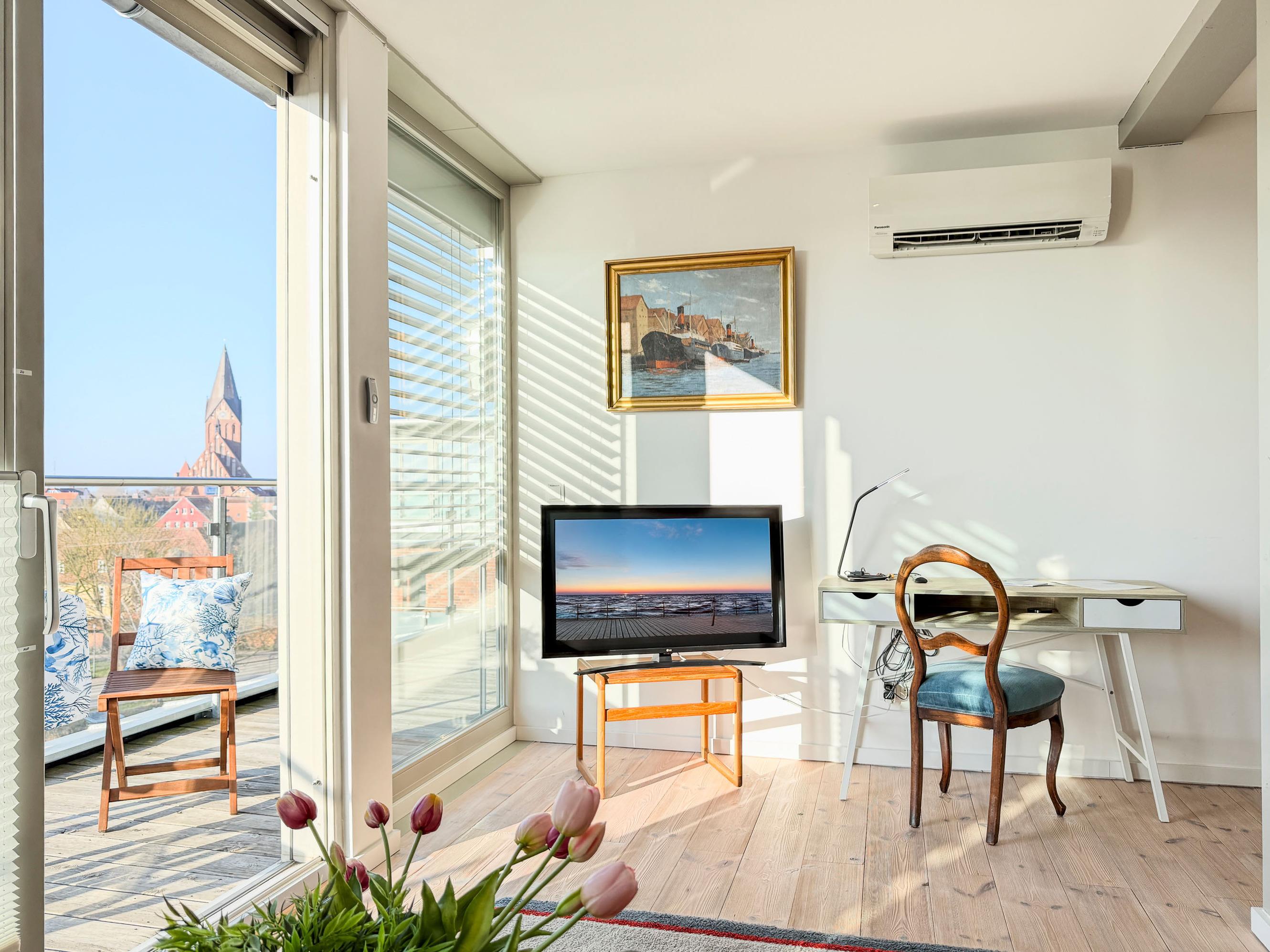 Dieses stilvolle Apartment im 5. Obergeschoss bietet auf 56 m² Platz für bis zu 3 Personen und besticht durch seine hochwertige Ausstattung sowie die ideale Lage in der Nähe des Barther Hafens.