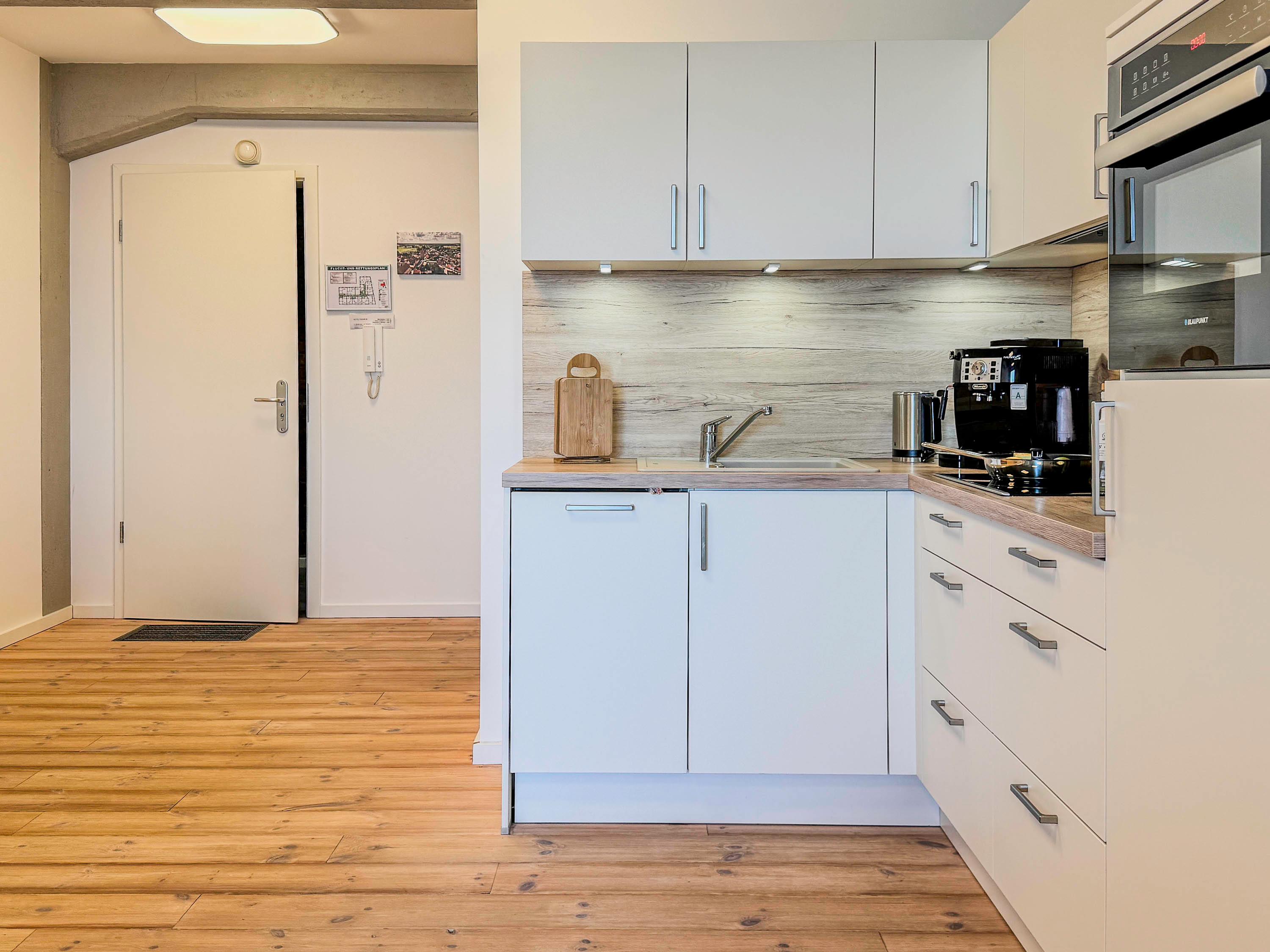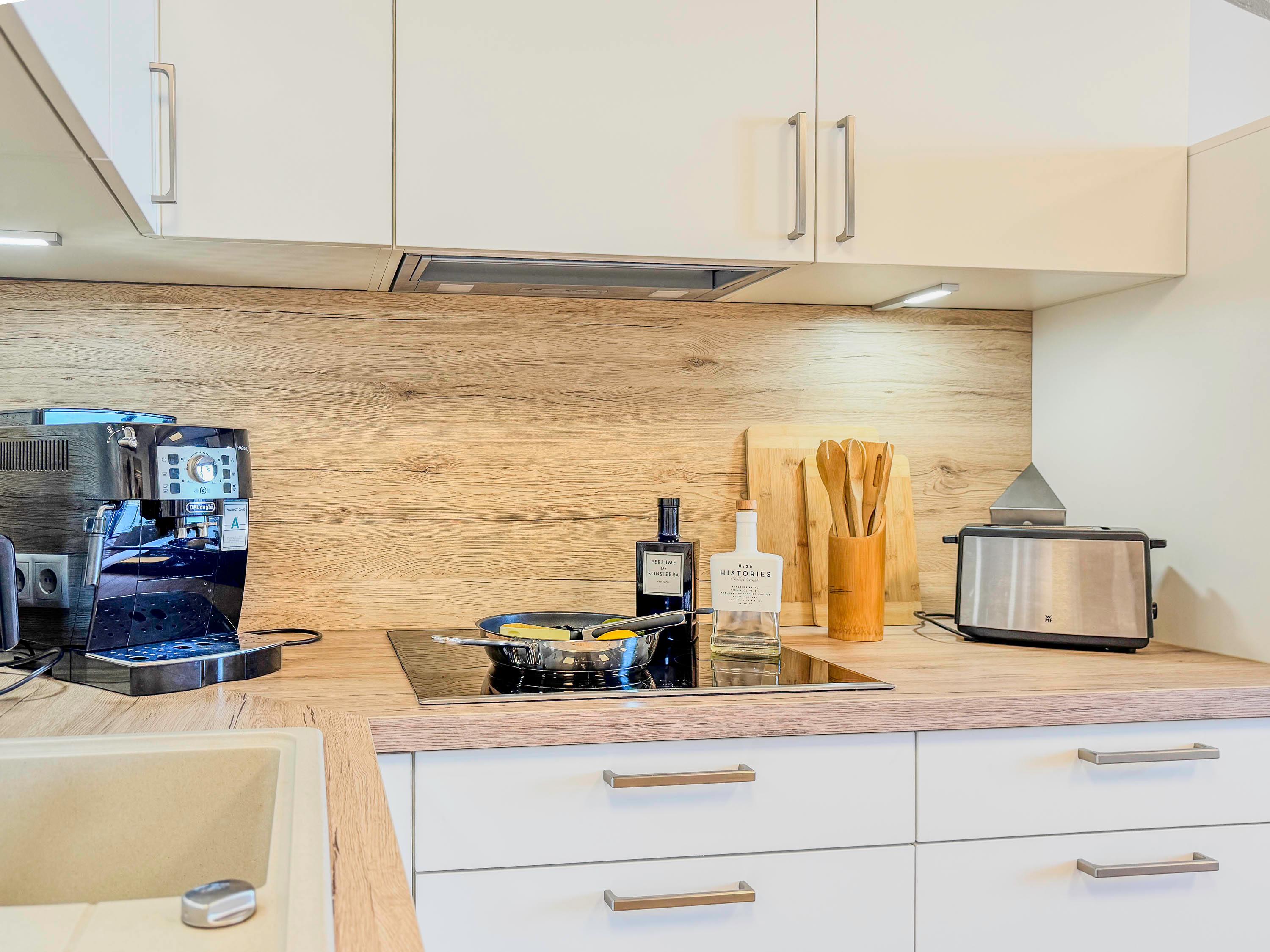 Küche: Voll ausgestattete Küchenzeile mit Ceranfeld, Kühlschrank, Kaffeevollautomat, Wasserkocher, Geschirr, Töpfen und Pfannen