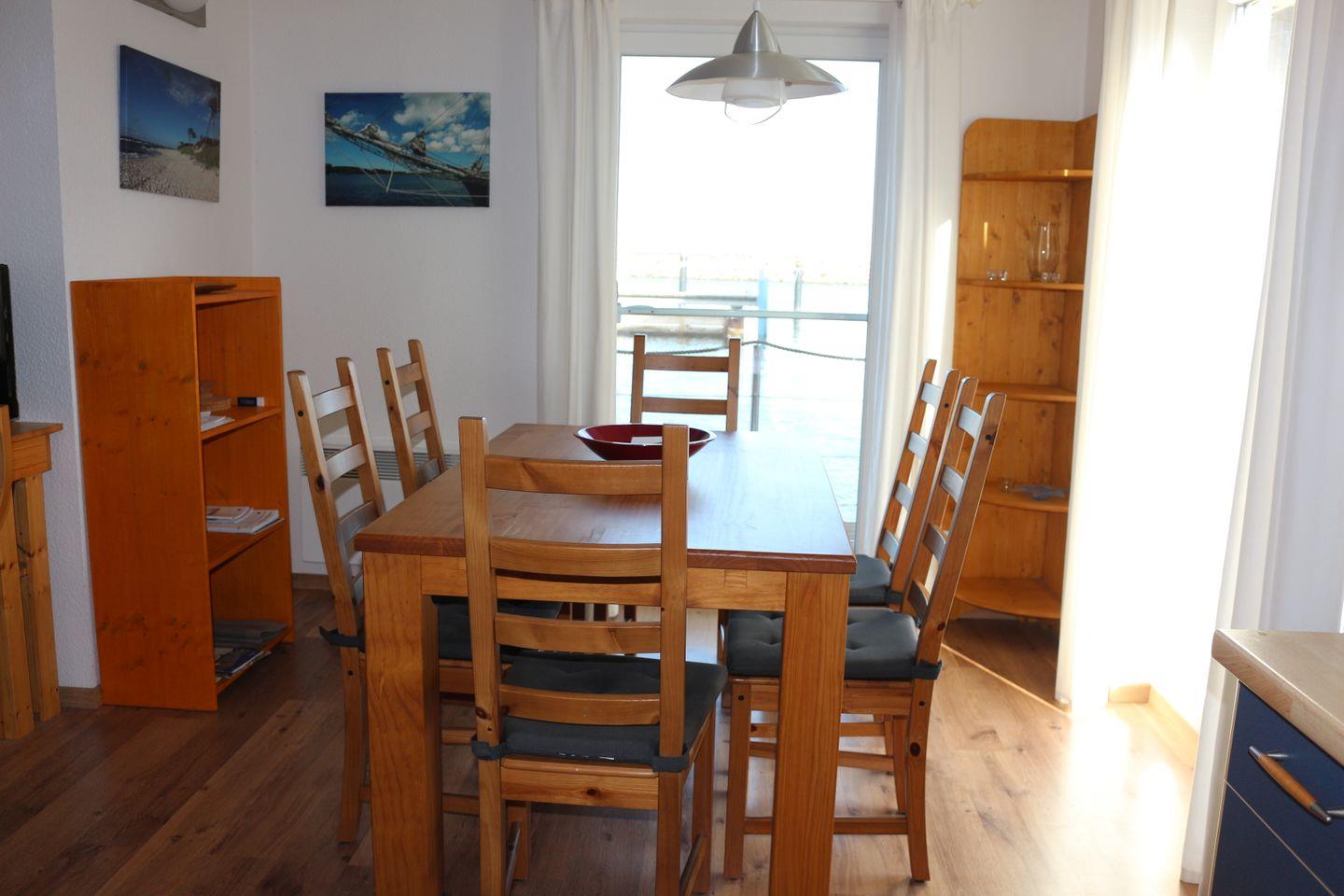 Im 1. Deck befindet sich das geräumige Wohnzimmer mit Essecke und Küchenzeile. Das Wohnzimmer ist modern-maritim eingerichtet mit einem Sofa und Schwing-Sessel mit Hocker-Kombination. Der Esstisch bietet Sitzgelegenheiten für bis zu 6 Personen, ein Kinderhochstuhl steht Ihnen kostenlos zur Verfügung. An das Wohnzimmer schließt sich eine Terrasse an, hier stehen 4 Gartenstühle und ein Tisch für Sie bereit.