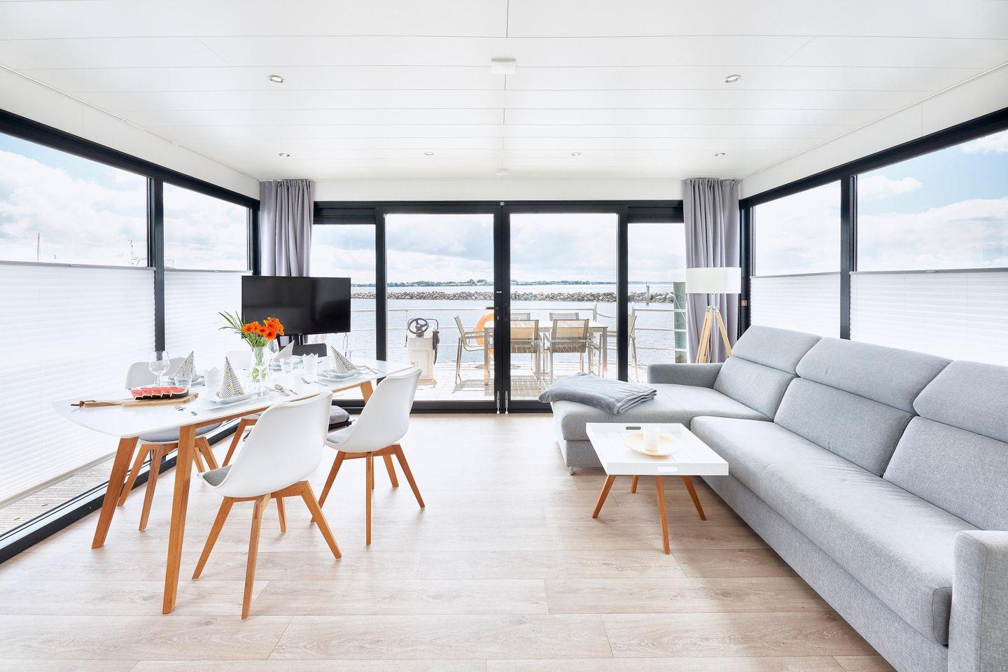 Erleben Sie Komfort und maritimes Flair auf dem Hausboot Fjordblik im Barther Yachthafen mit traumhaftem Boddenblick.