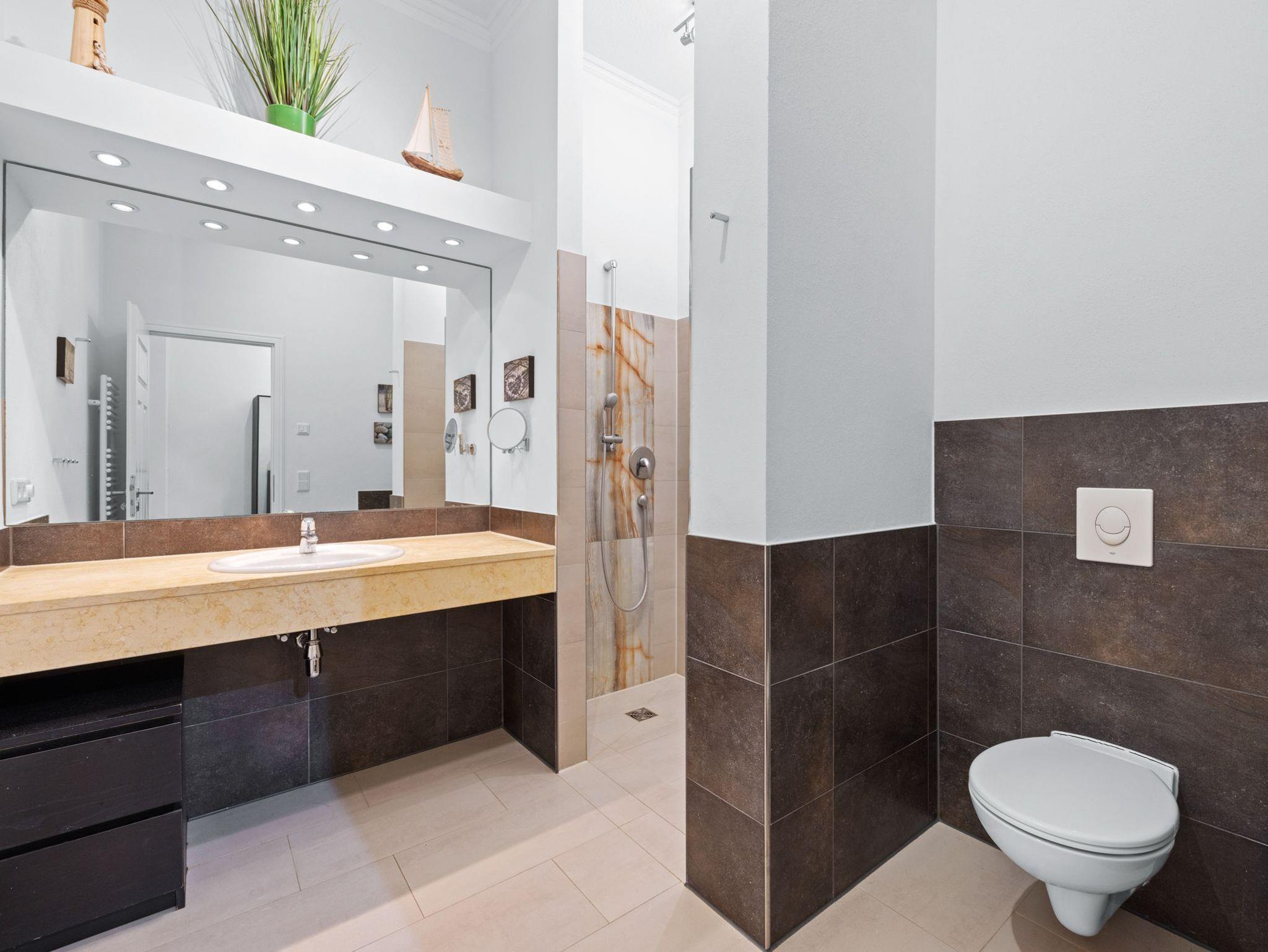Das Badezimmer ist modern gestaltet und überzeugt mit einer ebenerdigen, begehbaren Dusche, die Komfort und Eleganz verbindet. Hier starten Sie entspannt in den Tag oder lassen ihn wohltuend ausklingen.