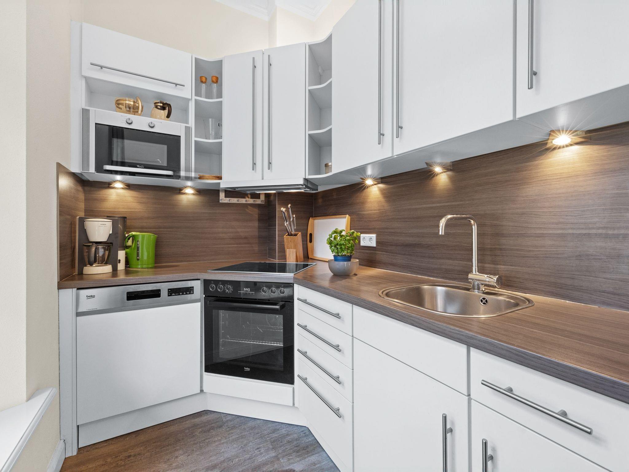 Die Küche schließt sich harmonisch an den Wohnraum an. Sie ist vollständig ausgestattet und bietet alles, was Sie für die Zubereitung Ihrer Lieblingsgerichte benötigen ? von kleinen Snacks bis zum ausgedehnten Abendessen. Durch die offene Gestaltung bleibt alles leicht, kommunikativ und wie aus einem Guss.