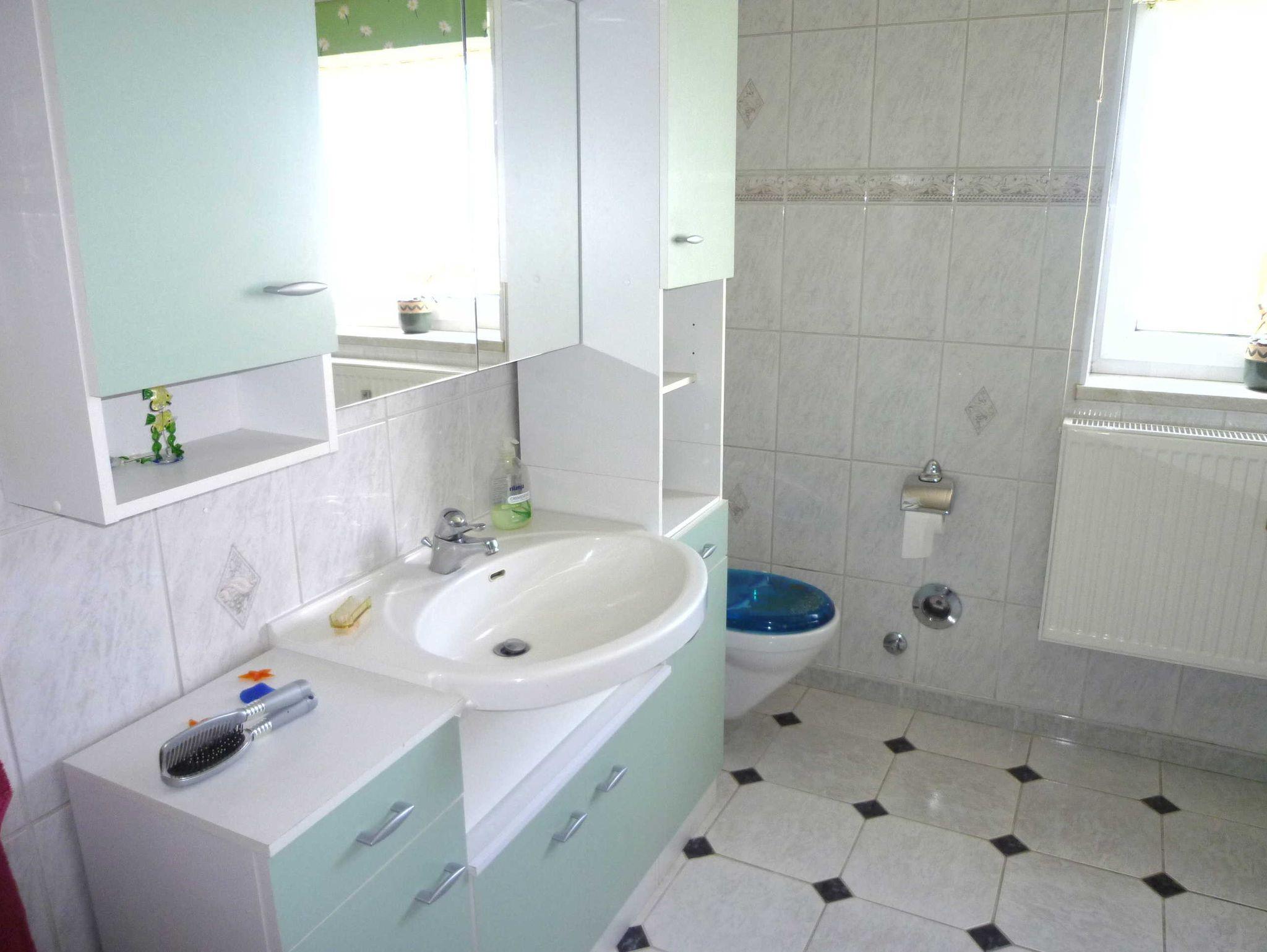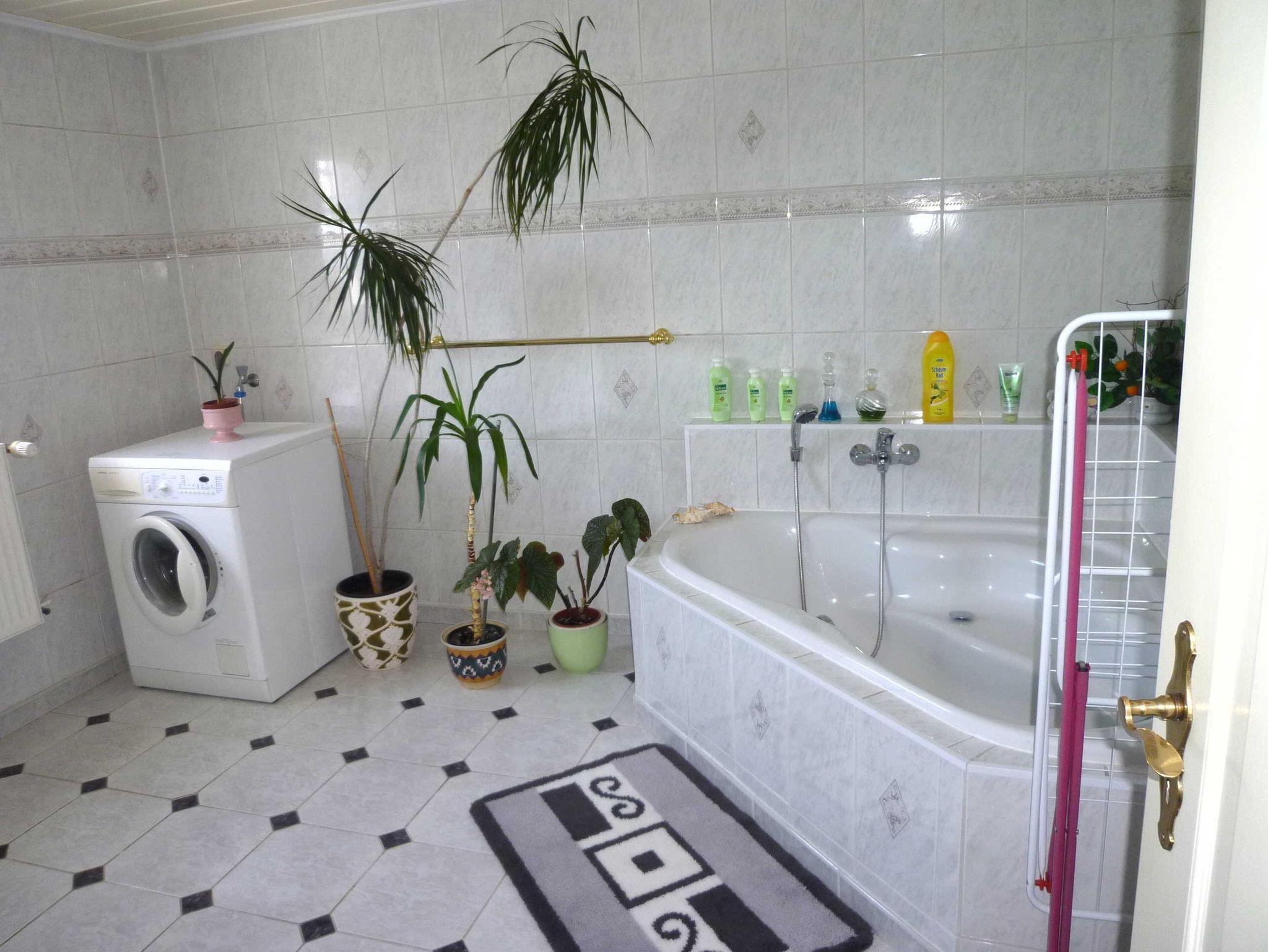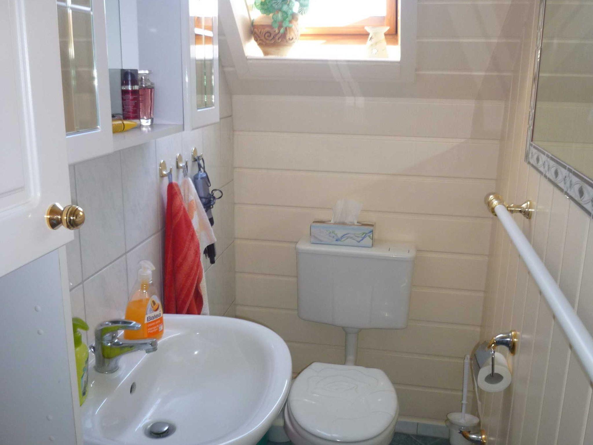 Zudem gibt es ein Bad mit Dusche/WC im Obergeschoss und ein zusätzliches, großes Bad mit Badewanne und WC im Erdgeschoss.