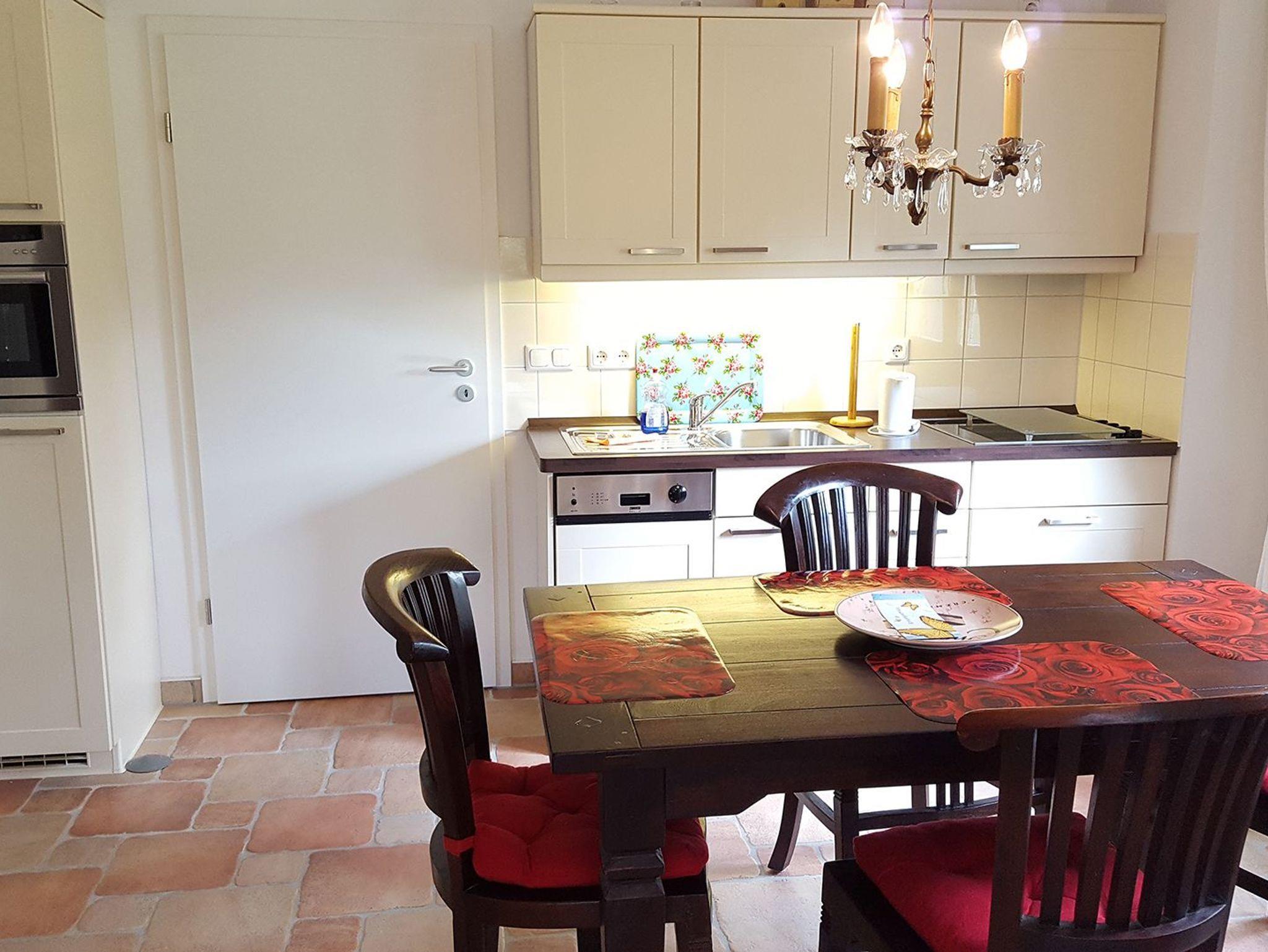 Die Wohnung ist modern ausgestattet und bietet auf 50 qm Platz und Stauraum für 2 Personen. Die gesamte Ferienwohnung verfügt über ein gemütliches Ambiente im Landhausstil. Dazu gehört ein Schlafzimmer mit Doppelbett, großem Kleiderschrank und Kommode, sowie ein elegantes [nbsp]Wohnzimmer mit einer Couch, Sesseln und einem geräumigen Schrank. Die voll ausgestattete Küche rundet den offenen Wohn- und Essbereich ab. Das Badezimmer mit Dusche und WC befindet sich neben dem Eingangsbereich, welcher eine Garderobe mit integriertem Schuhschrank bietet. Genießen Sie ein kühles Getränk auf der Terrasse mit Blick in den Park des Gutshauses oder auf die wunderschöne Ostsee und entspannen Sie nach einem erlebnisreichen Tag am Strand.